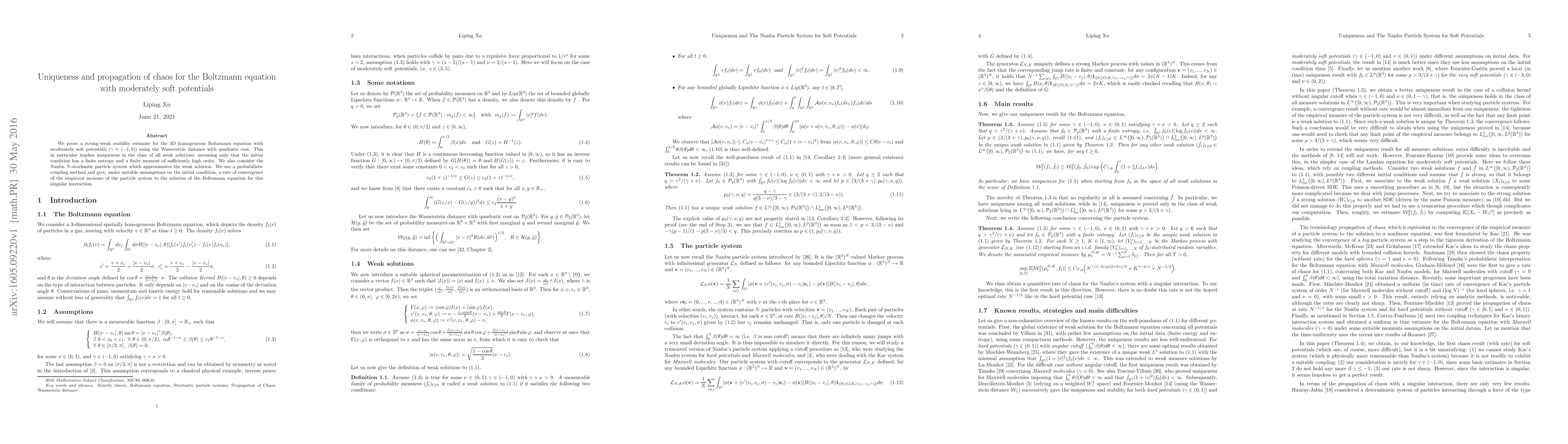This paper proves strong/weak stability for the 3D Boltzmann equation with moderately soft potentials, establishing uniqueness of weak solutions under finite entropy and high-order moment conditions. It also analyzes the Nanbu particle system, providing a convergence rate for its empirical measure to the Boltzmann equation solution using a probabilistic coupling method.