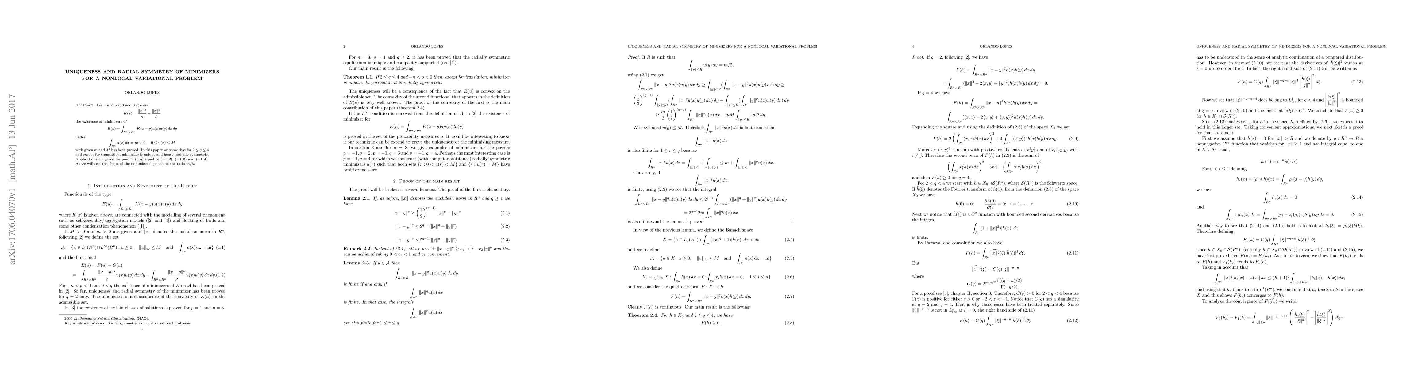 Summary: This paper establishes the uniqueness and radial symmetry of minimizers for a nonlocal variational problem, leveraging the convexity of the functional and employing the Fourier transform of tempered distributions as the primary technique.