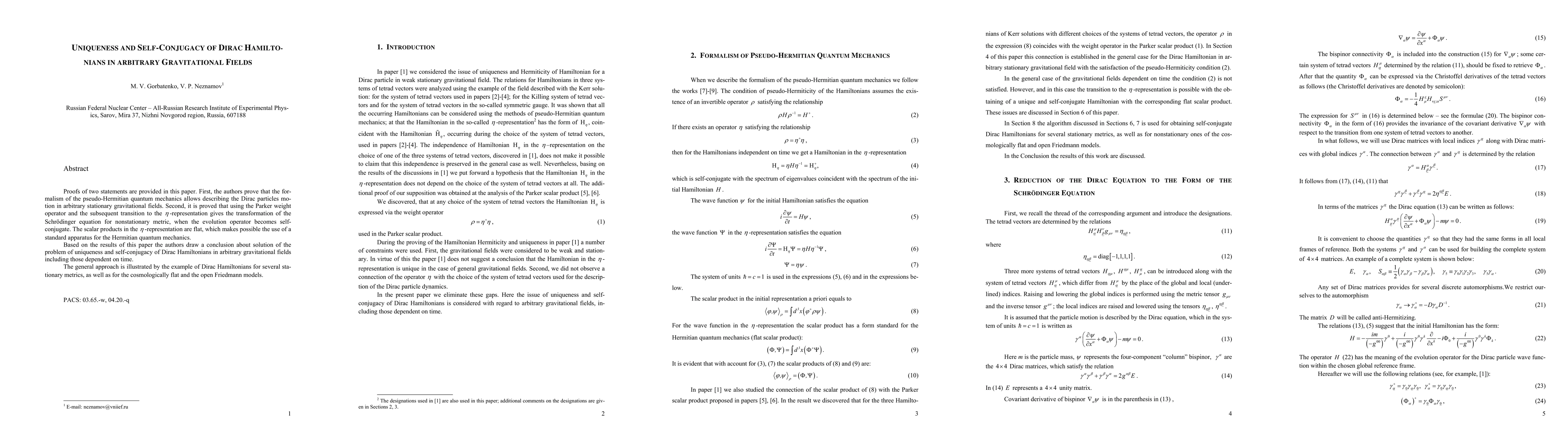 Proofs of two statements are provided in this paper. First, the authors prove that the formalism of the pseudo-Hermitian quantum mechanics allows describing the Dirac particles motion in arbitrary stationary gravitational fields. Second, it is proved that using the Parker weight operator and the subsequent transition to the \eta -representation gives the transformation of the Schroedinger equation for nonstationary metric, when the evolution operator becomes self-conjugate. The scalar products in the \eta -representation are flat, which makes possible the use of a standard apparatus for the Hermitian quantum mechanics. Based on the results of this paper the authors draw a conclusion about solution of the problem of uniqueness and self-conjugacy of Dirac Hamiltonians in arbitrary gravitational fields including those dependent on time. The general approach is illustrated by the example of Dirac Hamiltonians for several stationary metrics, as well as for the cosmologically flat and the open Friedmann models.