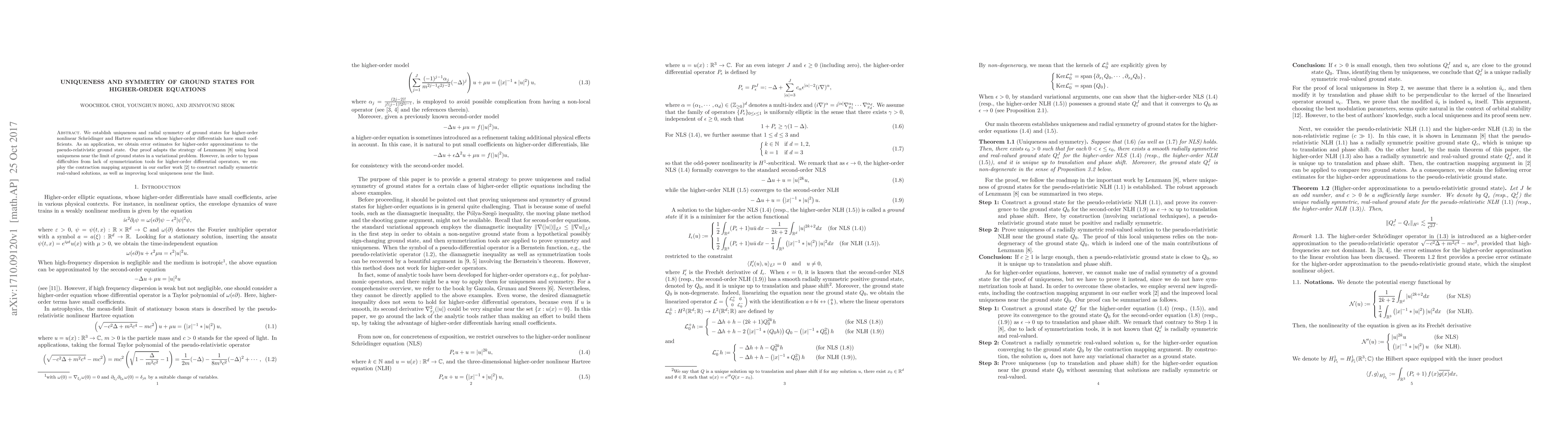 We establish uniqueness and radial symmetry of ground states for higher-order nonlinear Schr\"odinger and Hartree equations whose higher-order differentials have small coefficients. As an application, we obtain error estimates for higher-order approximations to the pseudo-relativistic ground state. Our proof adapts the strategy of Lenzmann using local uniqueness near the limit of ground states in a variational problem. However, in order to bypass difficulties from lack of symmetrization tools for higher-order differential operators, we employ the contraction mapping argument in our earlier work to construct radially symmetric real-valued solutions, as well as improving local uniqueness near the limit.