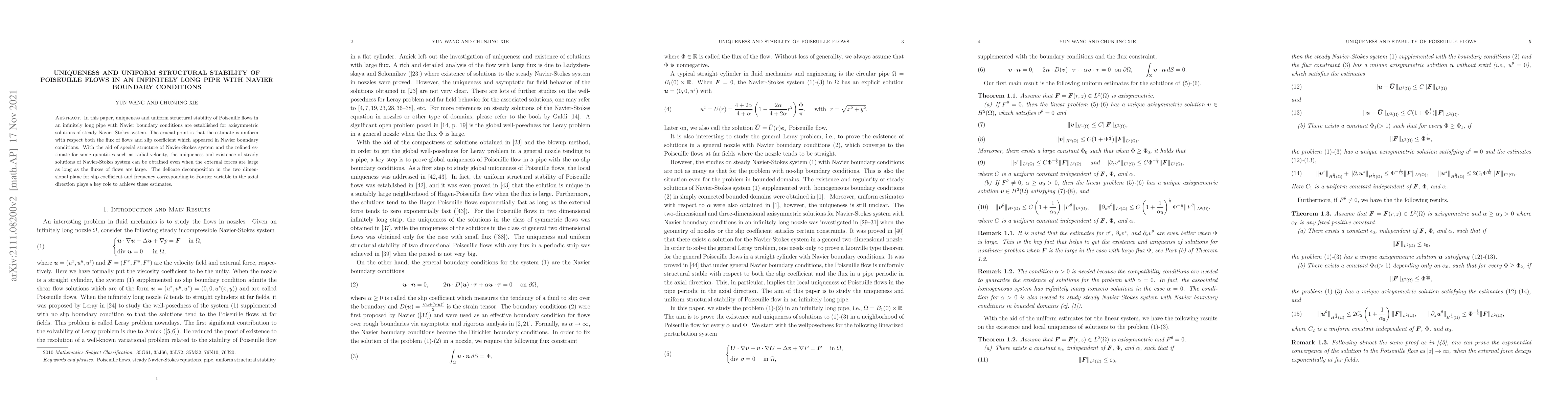 In this paper, uniqueness and uniform structural stability of Poiseuille flows in an infinitely long pipe with Navier boundary conditions are established for axisymmetric solutions of steady Navier-Stokes system. The crucial point is that the estimate is uniform with respect both the flux of flows and slip coefficient which appeared in Navier boundary conditions. With the aid of special structure of Navier-Stokes system and the refined estimate for some quantities such as radial velocity, the uniqueness and existence of steady solutions of Navier-Stokes system can be obtained even when the external forces are large as long as the fluxes of flows are large. The delicate decomposition in the two dimensional plane for slip coefficient and frequency corresponding to Fourier variable in the axial direction plays a key role to achieve these estimates.