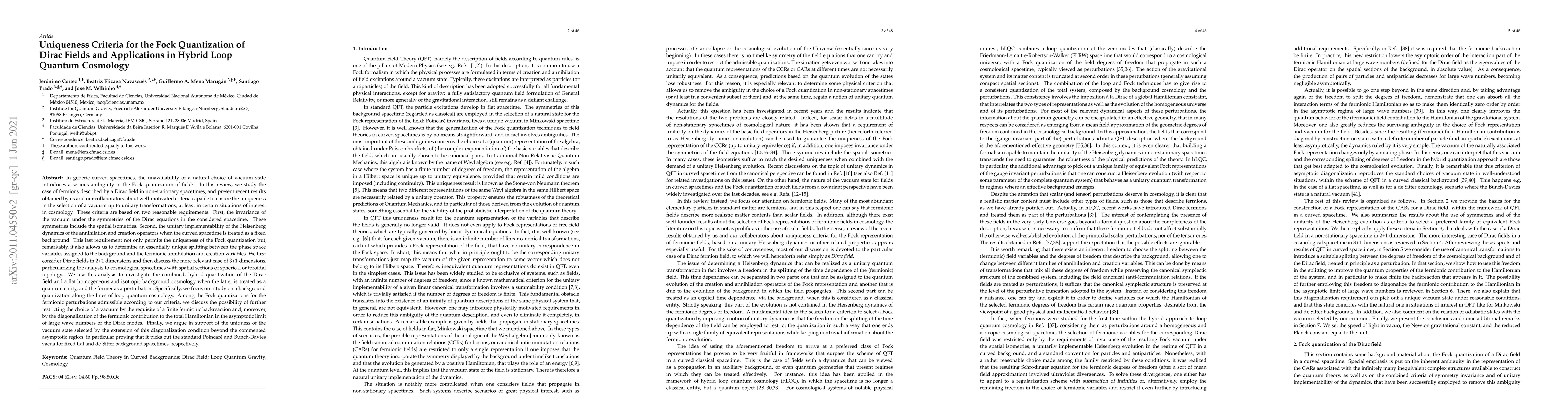 In generic curved spacetimes, the unavailability of a natural choice of vacuum state introduces a serious ambiguity in the Fock quantization of fields. In this review, we study the case of fermions described by a Dirac field in several cosmological spacetimes, and present recent results about well-motivated criteria that ensure the uniqueness in the selection of a vacuum up to unitary transformations. These criteria are based on two requirements. First, the invariance of the vacuum under the symmetries of the Dirac equations in the considered spacetime. Second, the unitary implementability of the Heisenberg dynamics of the annihilation and creation operators when the curved spacetime is treated as a fixed background. This last requirement not only permits the uniqueness of the Fock quantization but, remarkably, it also determines an essentially unique splitting between the phase space variables assigned to the background and the fermionic annihilation and creation variables. We first consider Dirac fields in cosmological spacetimes of 2+1 dimensions and then discuss the more relevant case of 3+1 dimensions. We use this analysis to investigate the hybrid loop quantization of a flat Friedmann-Lema\^itre-Robertson-Walker background cosmology coupled to a perturbative Dirac field. Among the Fock quantizations for the fermionic perturbations allowed by our criteria, we further restrict the choice of vacuum by demanding a finite fermionic backreaction and, moreover, by diagonalizing the fermionic contribution to the total Hamiltonian in the asymptotic limit of large wave numbers of the Dirac modes. Finally, we argue in support of the uniquess of the vacuum state selected by the extension of this diagonalization condition beyond the ultraviolet regime, proving that it picks out the standard Poincar\'e and Bunch-Davies vacua for fixed flat and de Sitter background spacetimes, respectively.