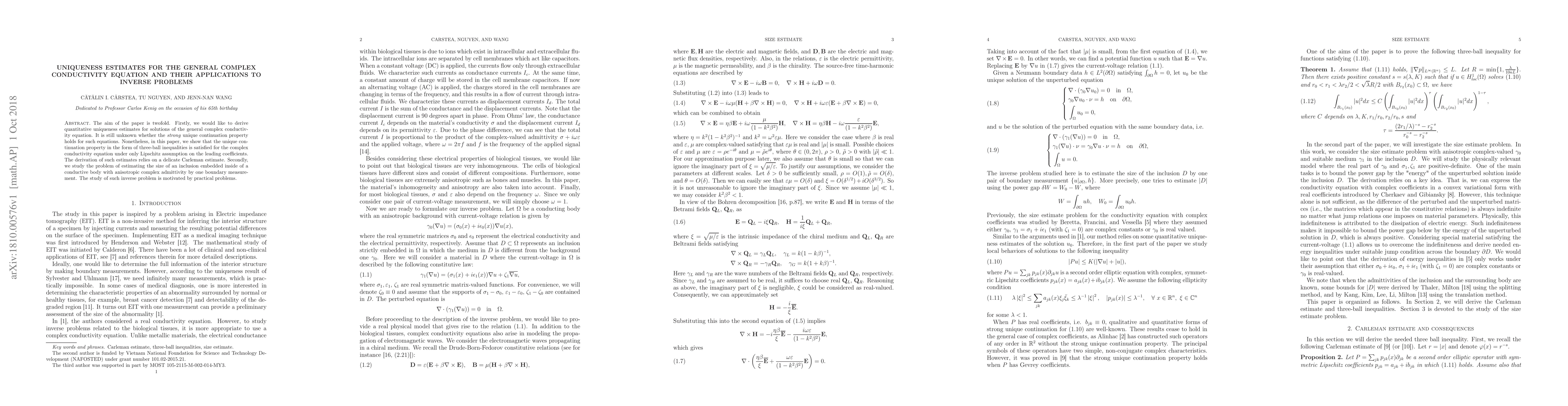 The aim of the paper is twofold. Firstly, we would like to derive quantitative uniqueness estimates for solutions of the general complex conductivity equation. It is still unknown whether the \emph{strong} unique continuation property holds for such equations. Nonetheless, in this paper, we show that the unique continuation property in the form of three-ball inequalities is satisfied for the complex conductivity equation under only Lipschitz assumption on the leading coefficients. The derivation of such estimates relies on a delicate Carleman estimate. Secondly, we study the problem of estimating the size of an inclusion embedded inside of a conductive body with anisotropic complex admittivity by one boundary measurement. The study of such inverse problem is motivated by practical problems.
