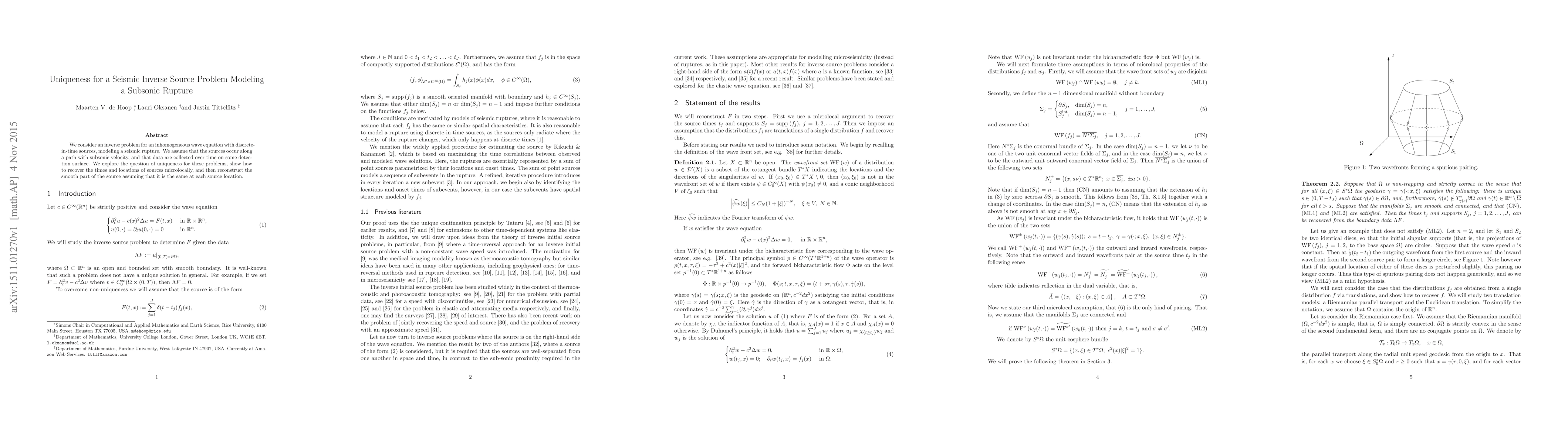 This paper investigates the uniqueness of an inverse problem for seismic ruptures modeled by an inhomogeneous wave equation with discrete-in-time sources. It demonstrates how to microlocally recover the times and locations of subsonic rupture sources and reconstructs the smooth source component.