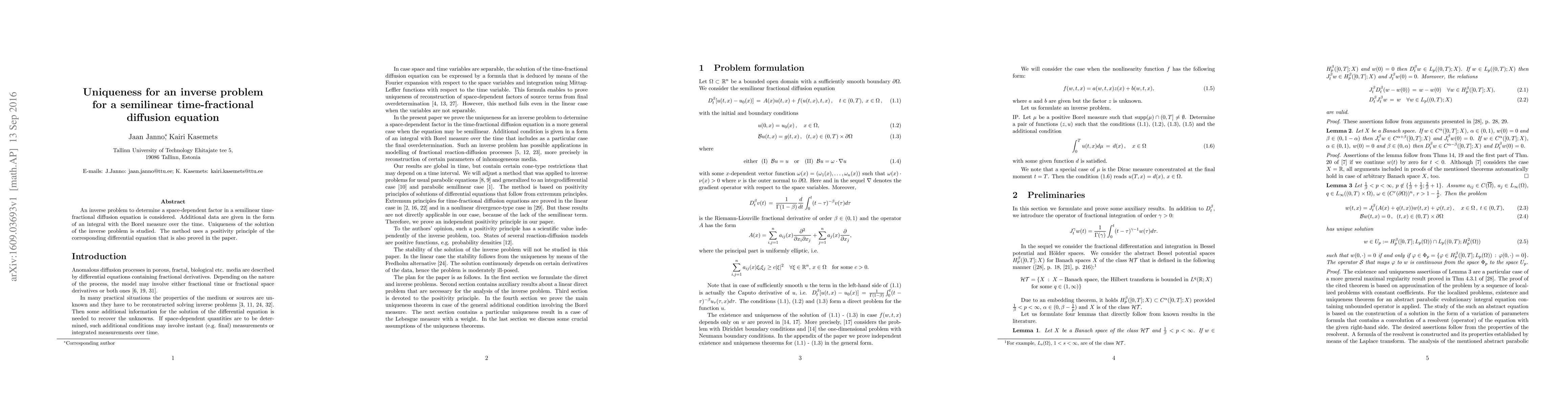 This paper investigates the uniqueness of solutions to an inverse problem for a semilinear time-fractional diffusion equation with a space-dependent factor. It employs a positivity principle of the differential equation to prove the uniqueness, using additional data in the form of an integral with a Borel measure over time.