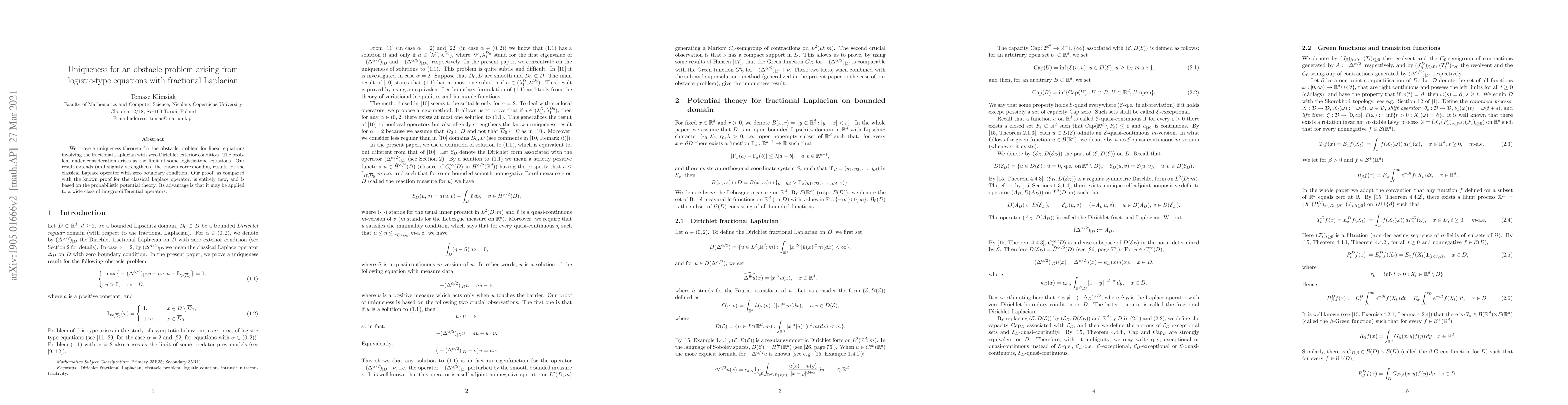 We prove a uniqueness theorem for the obstacle problem for linear equations involving the fractional Laplacian with zero Dirichlet exterior condition. The problem under consideration arises as the limit of some logistic-type equations. Our result extends (and slightly strengthens) the known corresponding results for the classical Laplace operator with zero boundary condition. Our proof, as compared with the known proof for the classical Laplace operator, is entirely new, and is based on the probabilistic potential theory. Its advantage is that it may be applied to a wide class of integro-differential operators.