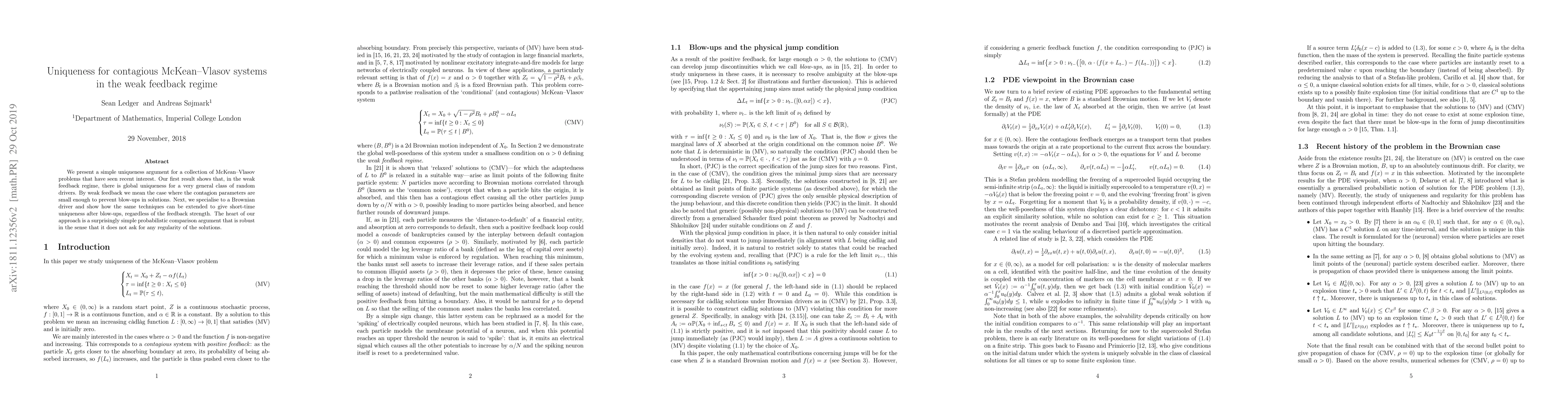 We present a simple uniqueness argument for a collection of McKean-Vlasov problems that have seen recent interest. Our first result shows that, in the weak feedback regime, there is global uniqueness for a very general class of random drivers. By weak feedback we mean the case where the contagion parameters are small enough to prevent blow-ups in solutions. Next, we specialise to a Brownian driver and show how the same techniques can be extended to give short-time uniqueness after blow-ups, regardless of the feedback strength. The heart of our approach is a surprisingly simple probabilistic comparison argument that is robust in the sense that it does not ask for any regularity of the solutions.