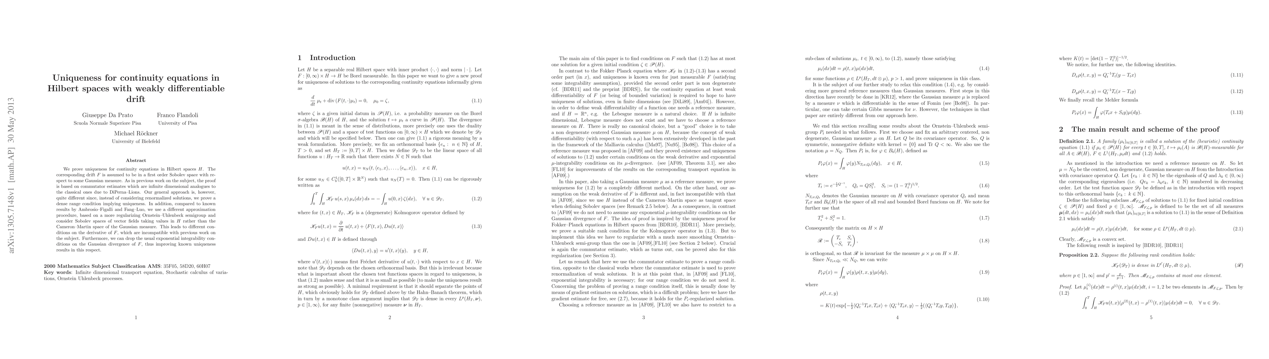 We prove uniqueness for continuity equations in Hilbert spaces $H$. The corresponding drift $F$ is assumed to be in a first order Sobolev space with respect to some Gaussian measure. As in previous work on the subject, the proof is based on commutator estimates which are infinite dimensional analogues to the classical ones due to DiPerna-Lions. Our general approach is, however, quite different since, instead of considering renormalized solutions, we prove a dense range condition implying uniqueness. In addition, compared to known results by Ambrosio-Figalli and Fang-Luo, we use a different approximation procedure, based on a more regularizing Ornstein-Uhlenbeck semigroup and consider Sobolev spaces of vector fields taking values in $H$ rather than the Cameron-Martin space of the Gaussian measure. This leads to different conditions on the derivative of $F$, which are incompatible with previous work on the subject. Furthermore, we can drop the usual exponential integrability conditions on the Gaussian divergence of $F$, thus improving known uniqueness results in this respect.