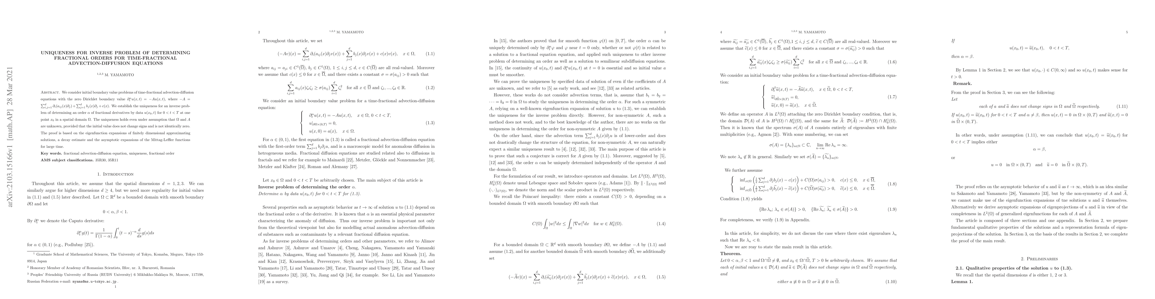 This paper establishes uniqueness for the inverse problem of determining the fractional order $\alpha$ in time-fractional advection-diffusion equations using data from a single spatial point. The proof leverages eigenfunction expansions, decay estimates, and asymptotic expansions of Mittag-Leffler functions.