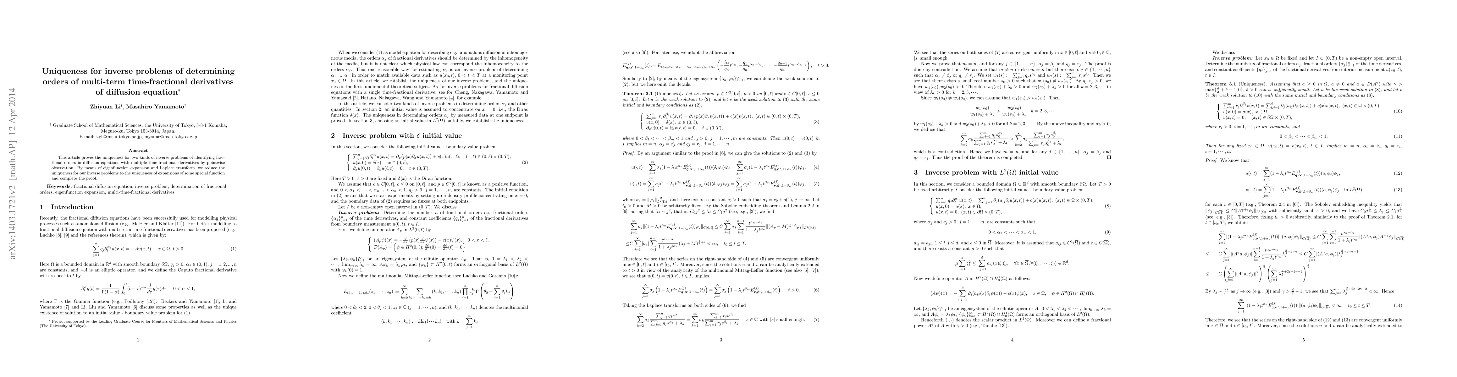This paper establishes the uniqueness of inverse problems for determining fractional orders in multi-term time-fractional diffusion equations using pointwise observations. The proof leverages eigenfunction expansion and Laplace transform to reduce the problem to the uniqueness of expansions of special functions.