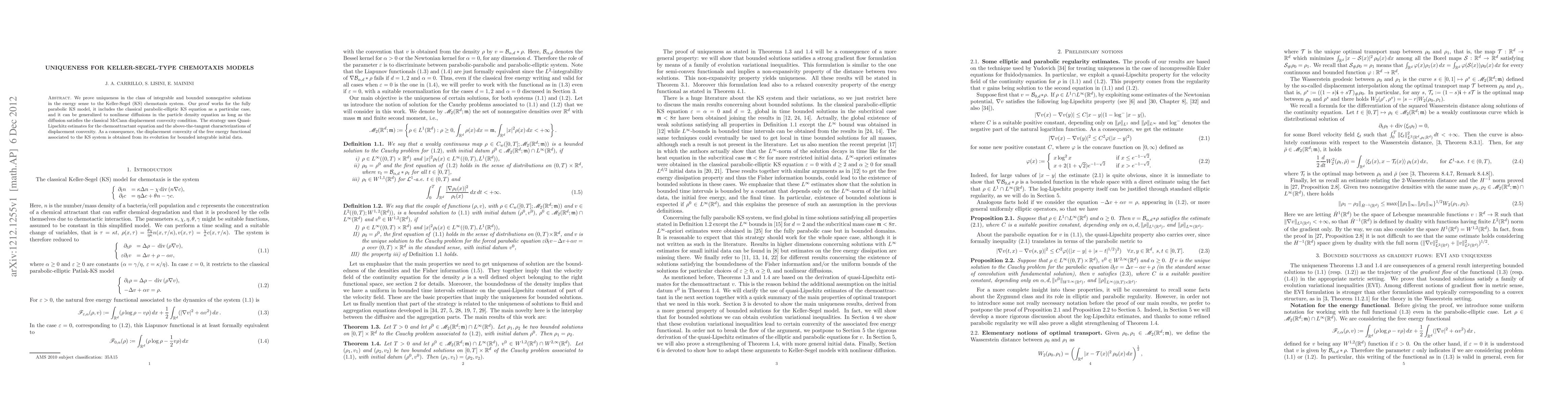 This paper proves uniqueness for the Keller-Segel chemotaxis system within the class of integrable and bounded nonnegative solutions, employing Quasi-Lipschitz estimates and displacement convexity conditions. The method is applicable to both the classical parabolic-elliptic KS equation and generalized nonlinear diffusions.