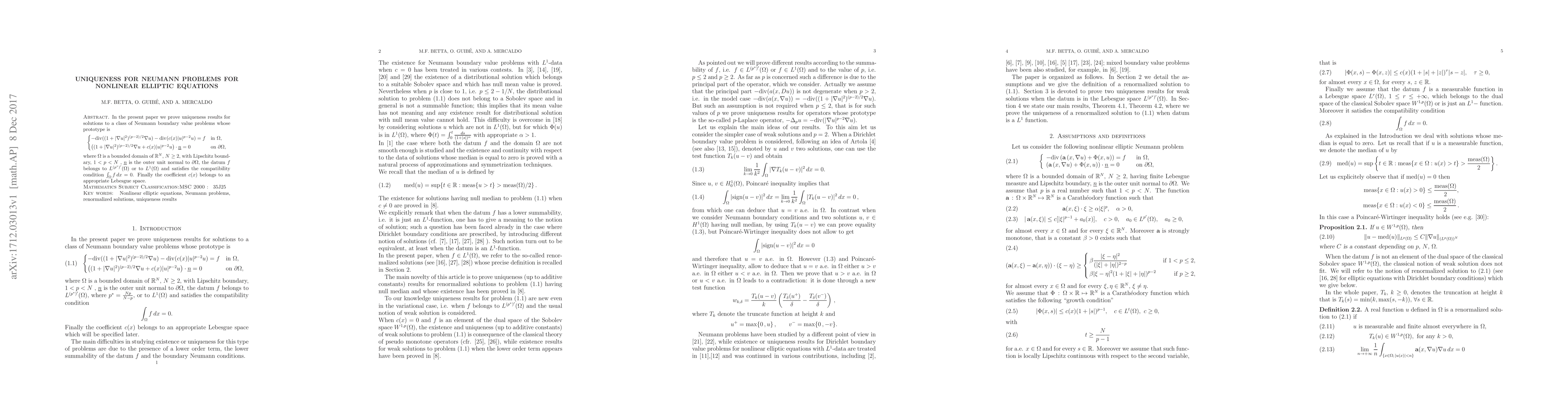 In the present paper we prove uniqueness results for solutions to a class of Neumann boundary value problems whose prototype is --div((1 + |$\nabla$u| 2) (p--2)/2 $\nabla$u) -- div(c(x)|u| p--2 u) = f in $\Omega$, (1 + |$\nabla$u| 2) (p--2)/2 $\nabla$u + c(x)|u| p--2 u $\times$ n = 0 on $\partial$$\Omega$,