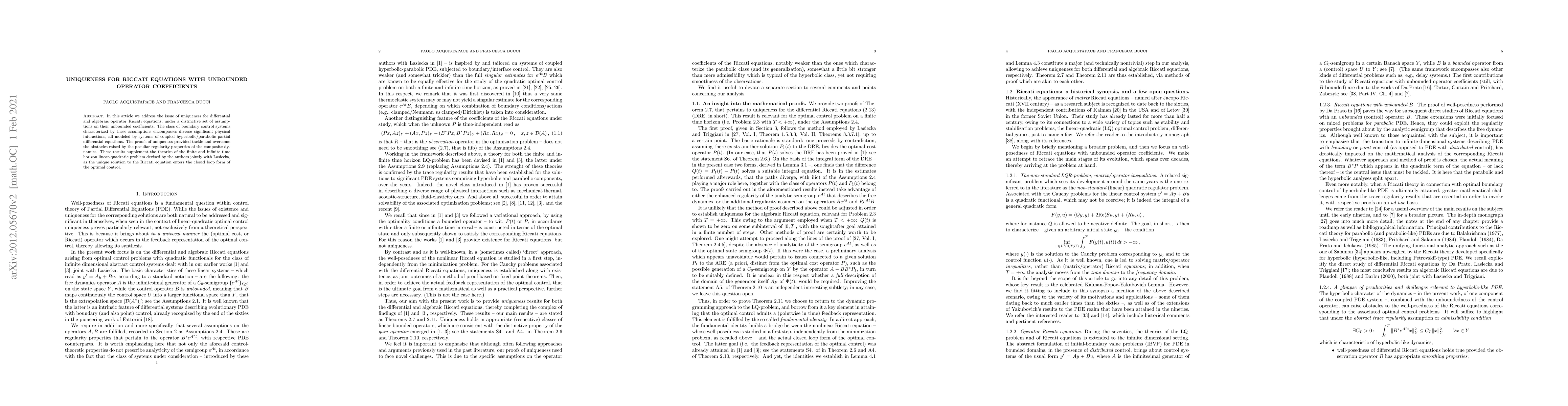 This paper investigates the uniqueness of solutions for differential and algebraic Riccati equations with unbounded operator coefficients, focusing on boundary control systems modeled by coupled hyperbolic/parabolic partial differential equations. The proofs presented overcome challenges due to the unique regularity properties of the system dynamics, supporting the authors' theories on linear-quadratic problems.