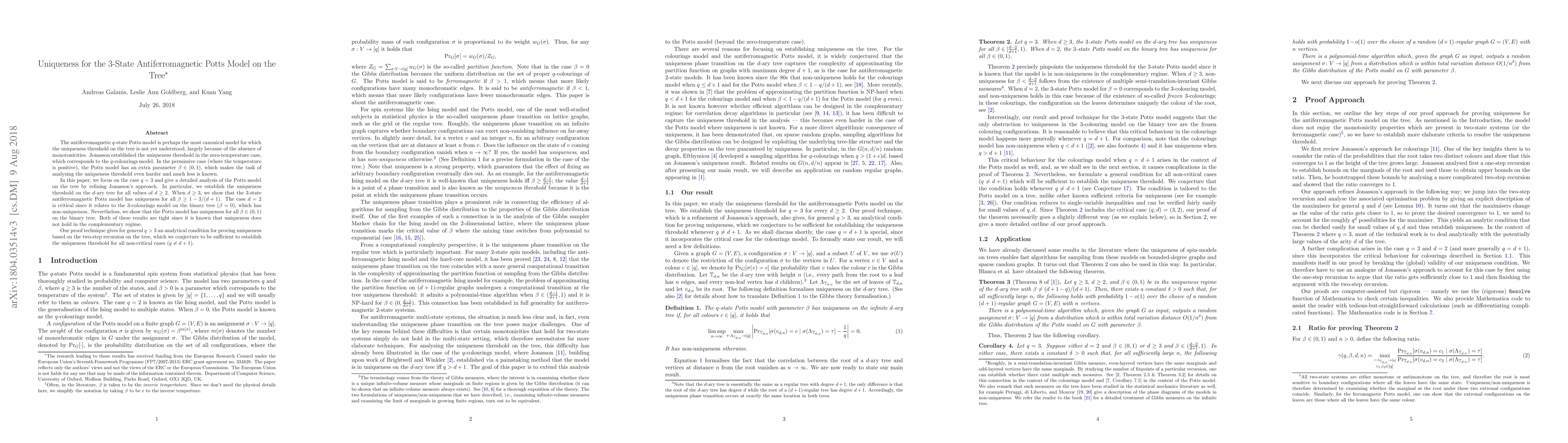 This paper establishes the uniqueness threshold for the 3-state antiferromagnetic Potts model on $d$-ary trees for all $d \geq 2$, showing that uniqueness holds for $\beta \geq 1-3/(d+1)$ when $d \geq 3$ and for all $\beta \in (0,1)$ when $d=2$. The authors refine Jonasson's approach and conjecture a general analytical condition for proving uniqueness based on a two-step recursion.