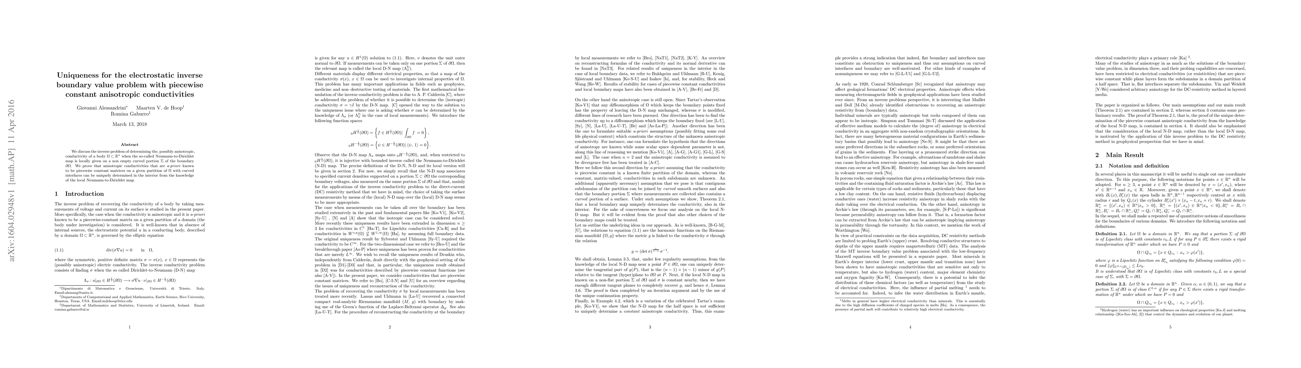 We discuss the inverse problem of determining the, possibly anisotropic, conductivity of a body $\Omega\subset\mathbb{R}^{n}$ when the so-called Neumann-to-Dirichlet map is locally given on a non empty curved portion $\Sigma$ of the boundary $\partial\Omega$. We prove that anisotropic conductivities that are \textit{a-priori} known to be piecewise constant matrices on a given partition of $\Omega$ with curved interfaces can be uniquely determined in the interior from the knowledge of the local Neumann-to-Dirichlet map.