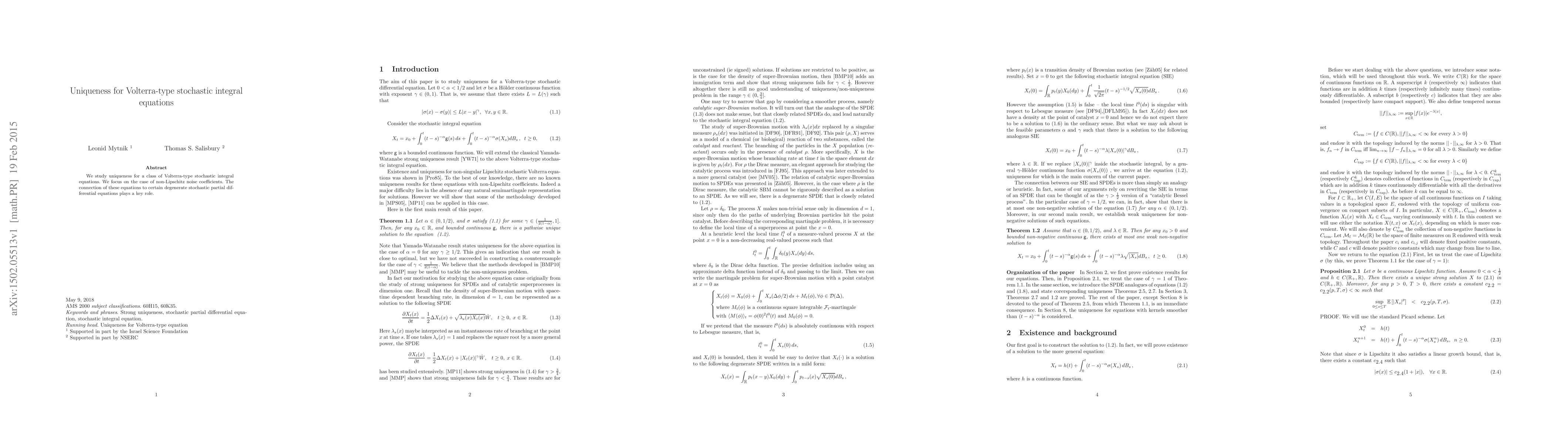 Summary: This paper investigates the uniqueness of solutions for a class of Volterra-type stochastic integral equations with non-Lipschitz noise coefficients, emphasizing the link to degenerate stochastic partial differential equations.