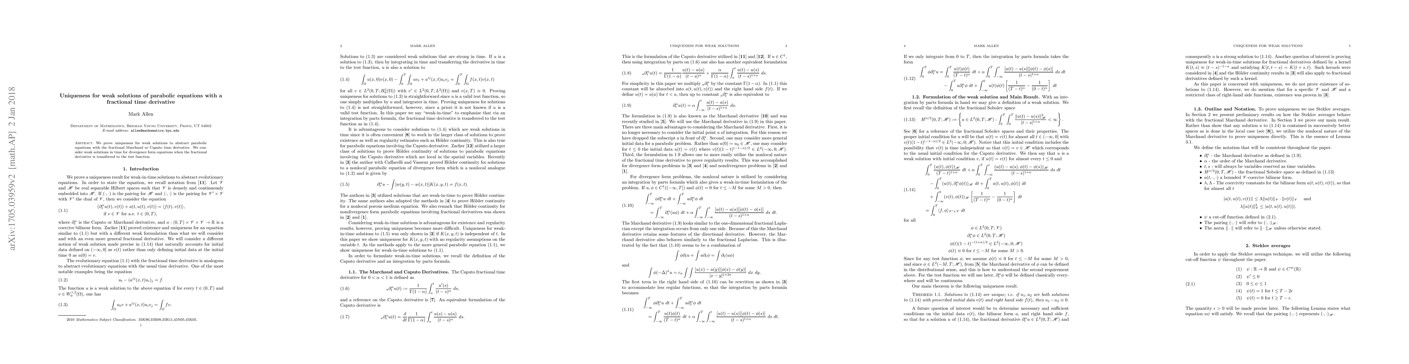 Summary: This paper establishes uniqueness for weak solutions of abstract parabolic equations featuring fractional time derivatives, specifically the Marchaud or Caputo types, by transferring the fractional derivative to the test function. The focus is on divergence form equations.