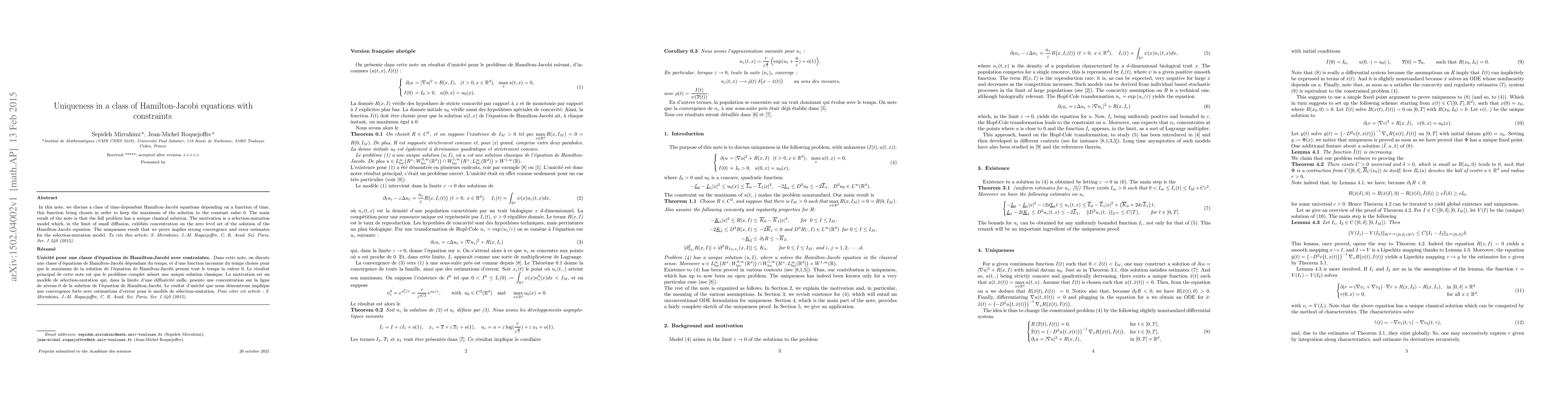 In this note, we discuss a class of time-dependent Hamilton-Jacobi equations depending on a function of time, this function being chosen in order to keep the maximum of the solution to the constant value 0. The main result of the note is that the full problem has a unique classical solution. The motivation is a selection-mutation model which, in the limit of small diffusion, exhibits concentration on the zero level set of the solution of the Hamilton-Jacobi equation. The uniqueness result that we prove implies strong convergence and error estimates for the selection-mutation model.