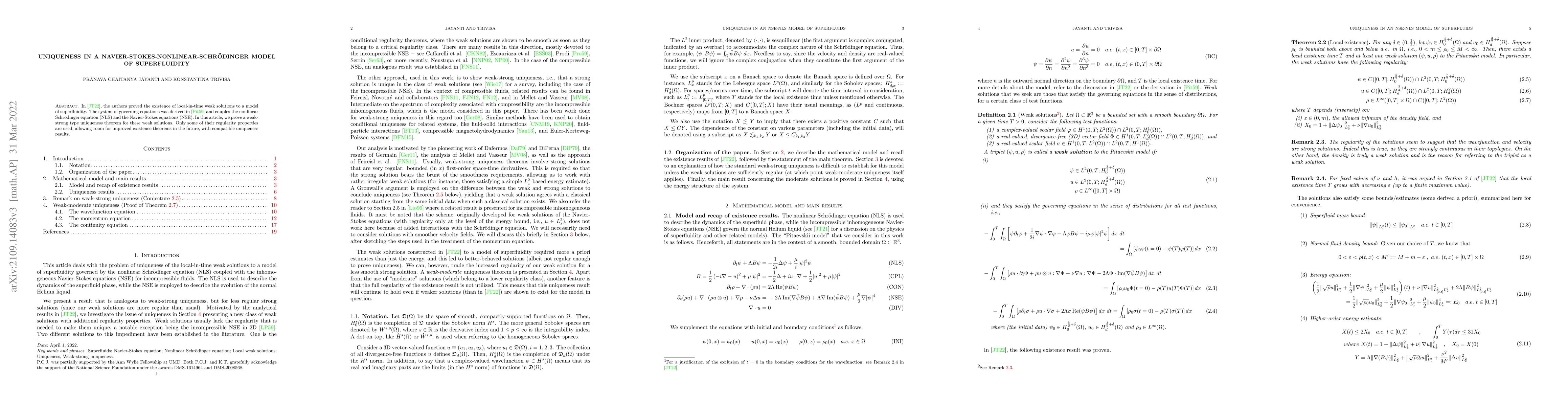 In a previous paper [Jayanti, P.C., Trivisa, K. Local Existence of Solutions to a Navier-Stokes-Nonlinear-Schr\"odinger Model of Superfluidity. J. Math. Fluid Mech. 24, 46 (2022)], the authors proved the existence of local-in-time weak solutions to a model of superfluidity. The system of governing equations was derived by Pitaevskii in 1959 and couples the nonlinear Schr\"odinger equation (NLS) and the Navier-Stokes equations (NSE). In this article, we prove a weak-strong type uniqueness theorem for these weak solutions. Only some of their regularity properties are used, allowing room for improved existence theorems in the future, with compatible uniqueness results.