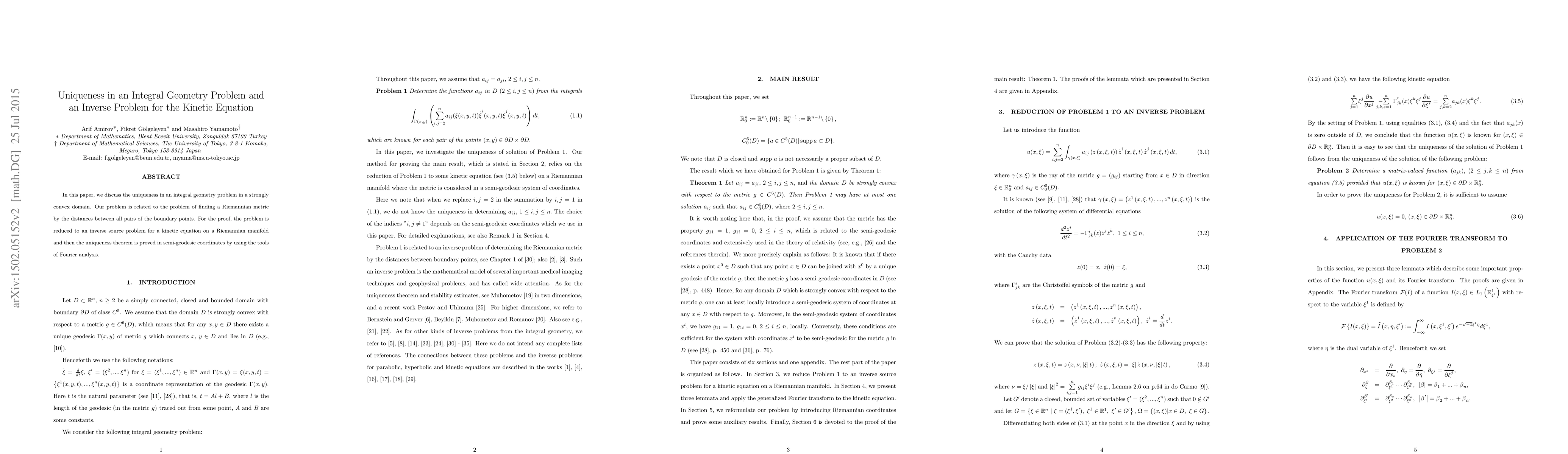 This paper proves the uniqueness in an integral geometry problem within a strongly convex domain, specifically for determining a Riemannian metric from boundary distances. The proof leverages an inverse source problem for a kinetic equation on a Riemannian manifold, utilizing Fourier analysis in semi-geodesic coordinates.