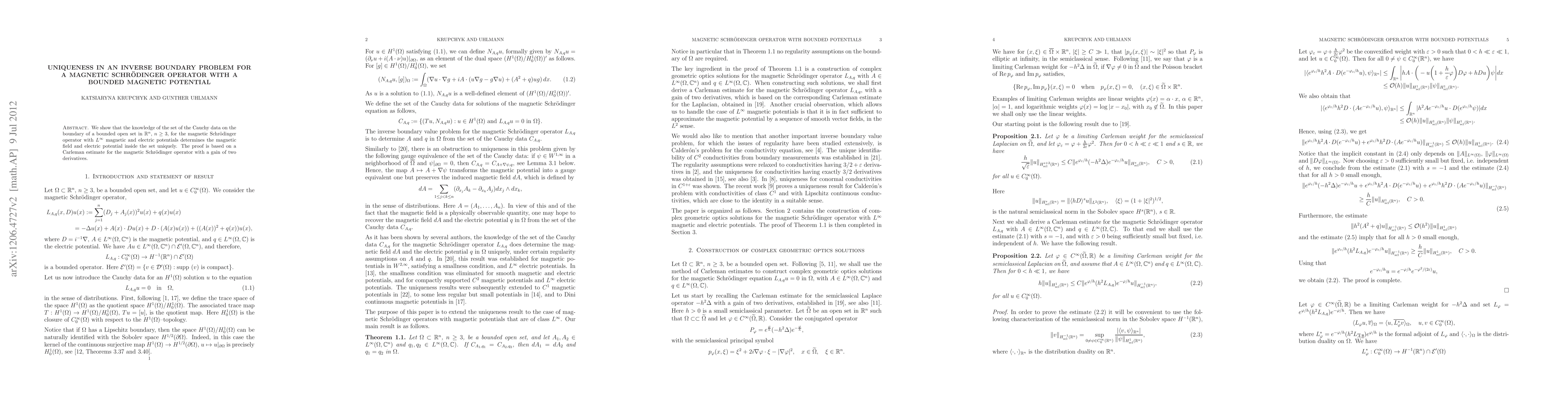 We show that the knowledge of the set of the Cauchy data on the boundary of a bounded open set in $\R^n$, $n\ge 3$, for the magnetic Schr\"odinger operator with $L^\infty$ magnetic and electric potentials determines the magnetic field and electric potential inside the set uniquely. The proof is based on a Carleman estimate for the magnetic Schr\"odinger operator with a gain of two derivatives.