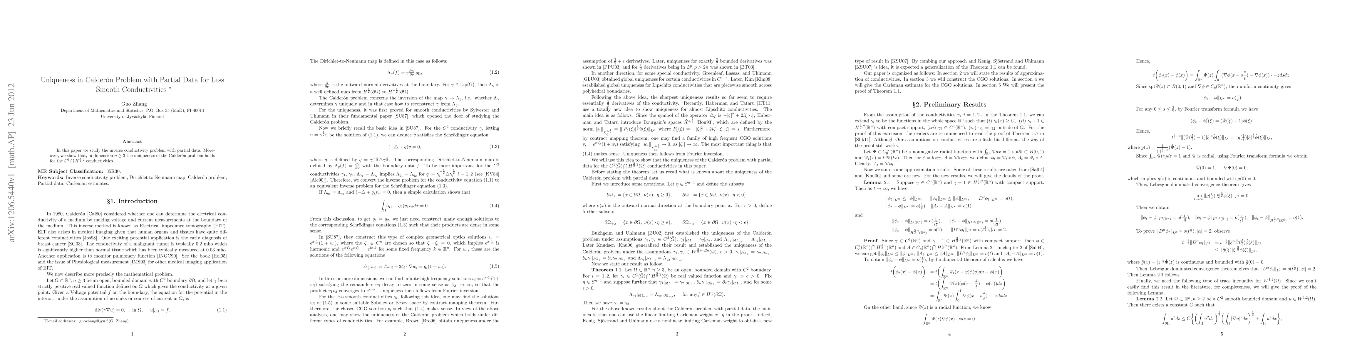 This paper investigates the inverse conductivity problem using partial data and demonstrates that uniqueness in the Calderón problem is maintained for conductivities that are $C^{1}\bigcap H^{3/2, 2}$ in dimensions $n\geq 3$.