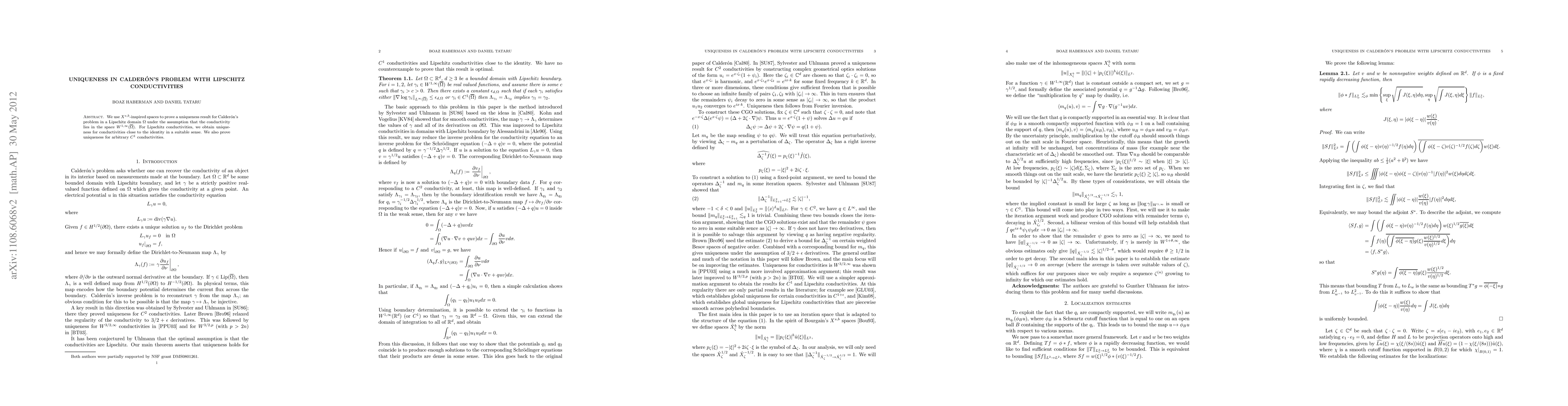 This paper proves uniqueness in Calderon's problem for Lipschitz conductivities using X^{s,b}-inspired spaces. It demonstrates uniqueness for conductivities near the identity and for arbitrary C^1 conductivities in a Lipschitz domain.