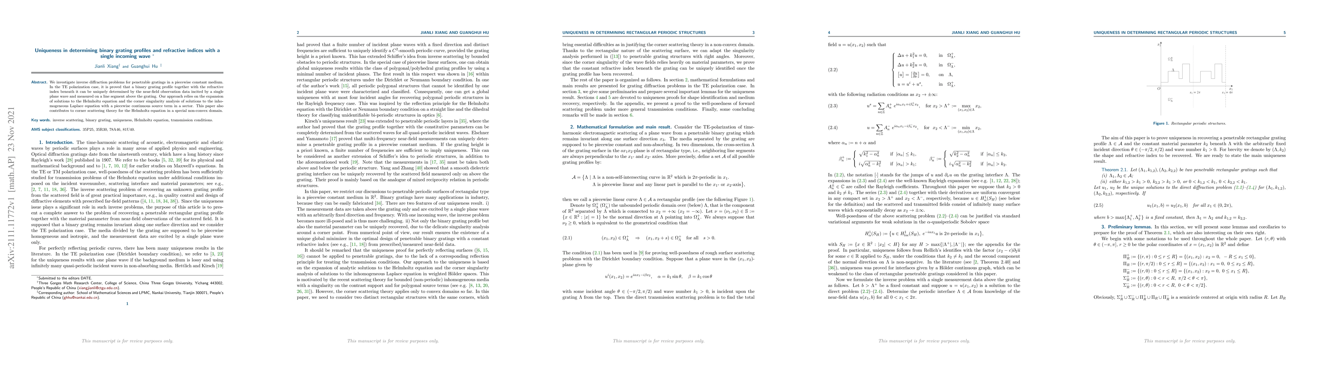 This paper proves the uniqueness of determining binary grating profiles and refractive indices beneath them using near-field data from a single incoming plane wave. The approach leverages the expansion of Helmholtz equation solutions and corner singularity analysis in non-convex domains.