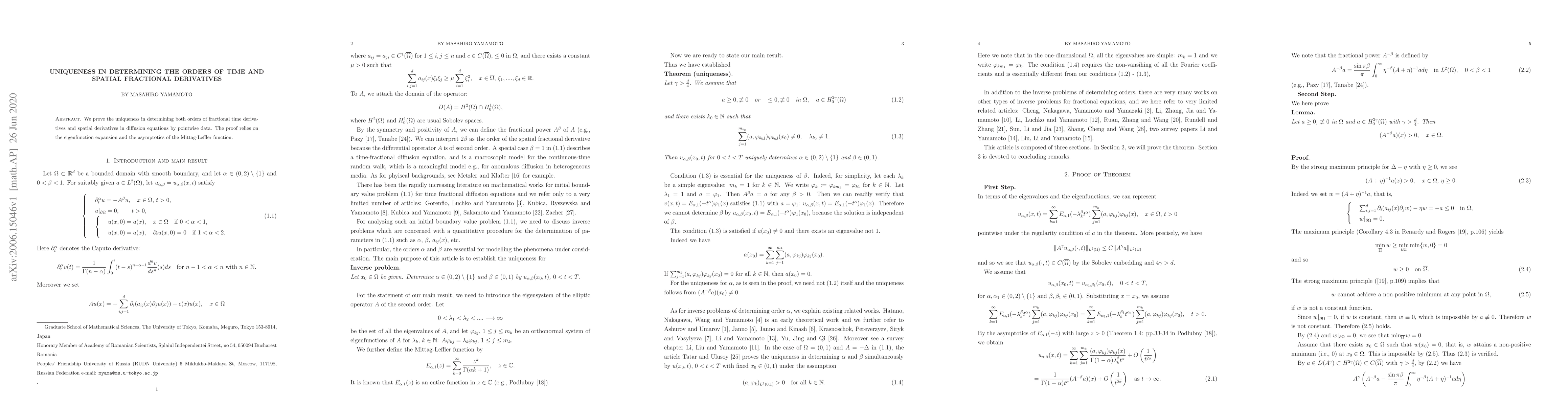This paper proves the uniqueness of determining the orders of fractional time and spatial derivatives in diffusion equations using pointwise data. The proof employs eigenfunction expansion and the asymptotic properties of the Mittag-Leffler function.