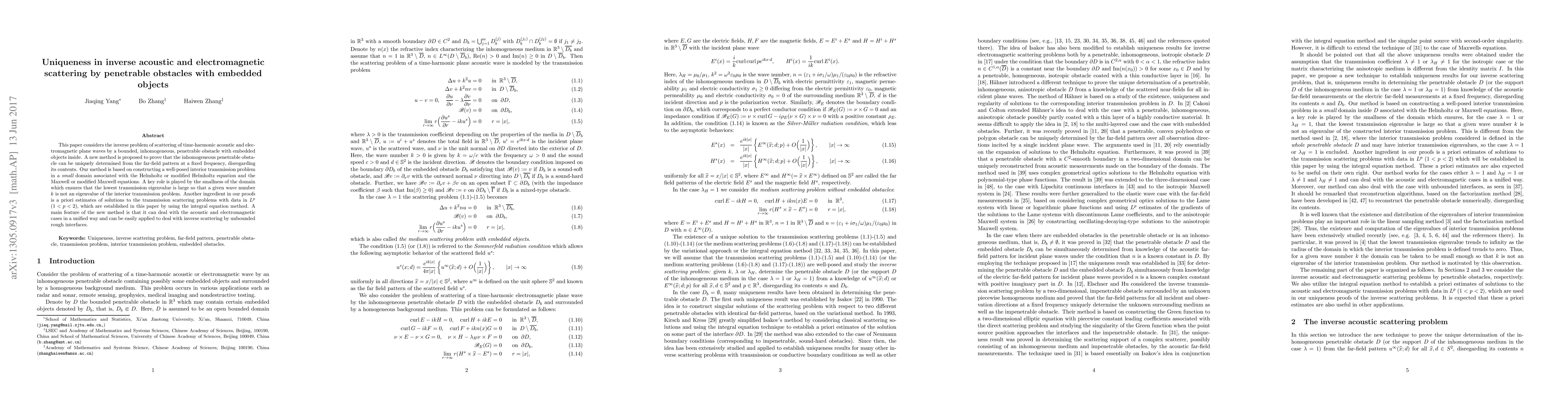 This paper considers the inverse problem of scattering of time-harmonic acoustic and electromagnetic plane waves by a bounded, inhomogeneous, penetrable obstacle with embedded objects inside. A new method is proposed to prove that the inhomogeneous penetrable obstacle can be uniquely determined from the far-field pattern at a fixed frequency, disregarding its contents. Our method is based on constructing a well-posed interior transmission problem in a small domain associated with the Helmholtz or modified Helmholtz equation and the Maxwell or modified Maxwell equations. A key role is played by the smallness of the domain which ensures that the lowest transmission eigenvalue is large so that a given wave number k is not an eigenvalue of the interior transmission problem. Another ingredient in our proofs is a priori estimates of solutions to the transmission scattering problems with data in Lp (1