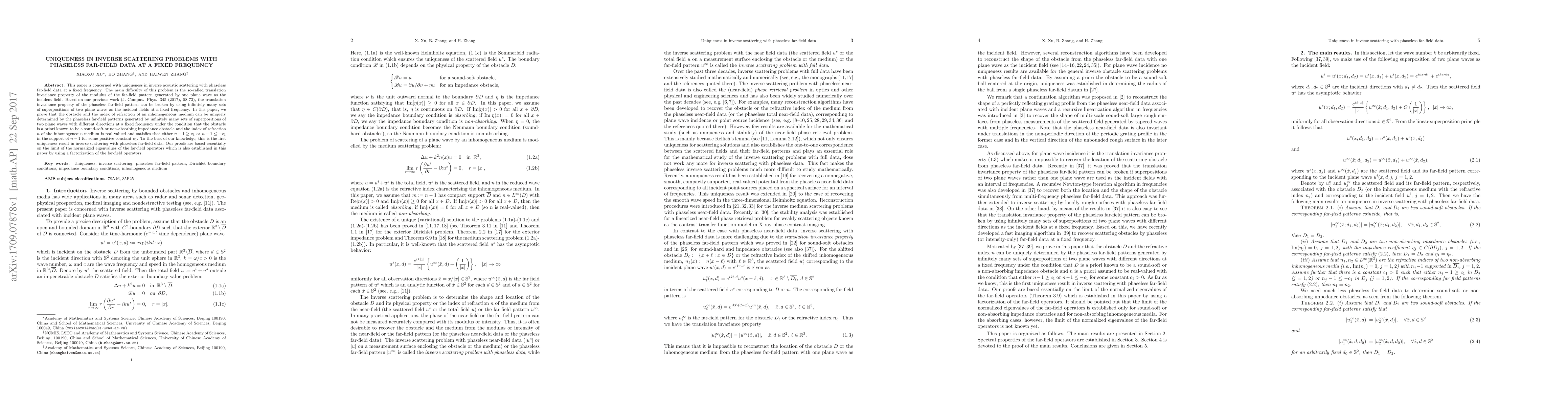 This paper proves uniqueness in inverse acoustic scattering using phaseless far-field data at a fixed frequency, overcoming translation invariance issues. It demonstrates that the obstacle and medium's index of refraction can be uniquely determined by far-field patterns generated from multiple plane wave superpositions, under specific conditions.