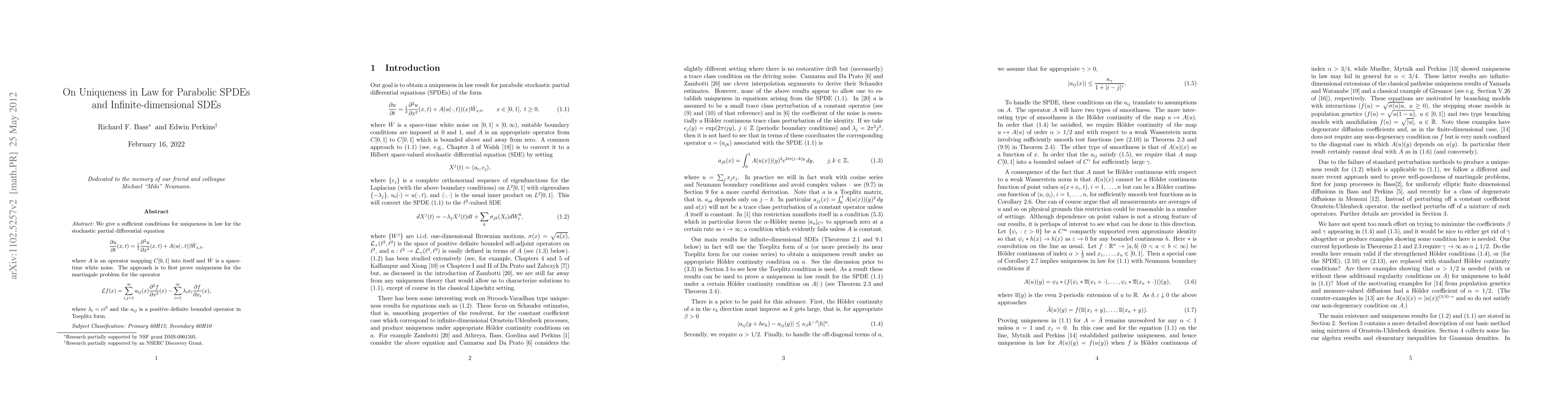 We prove uniqueness in law for a class of parabolic stochastic partial differential equations in an interval driven by a functional A(u) of the temperature u times a space-time white noise. The functional A(u) is H\"older continuous in u of order greater than 1/2. Our method involves looking at an associated system of infinite-dimensional stochastic differential equations and we obtain a uniqueness result for such systems.