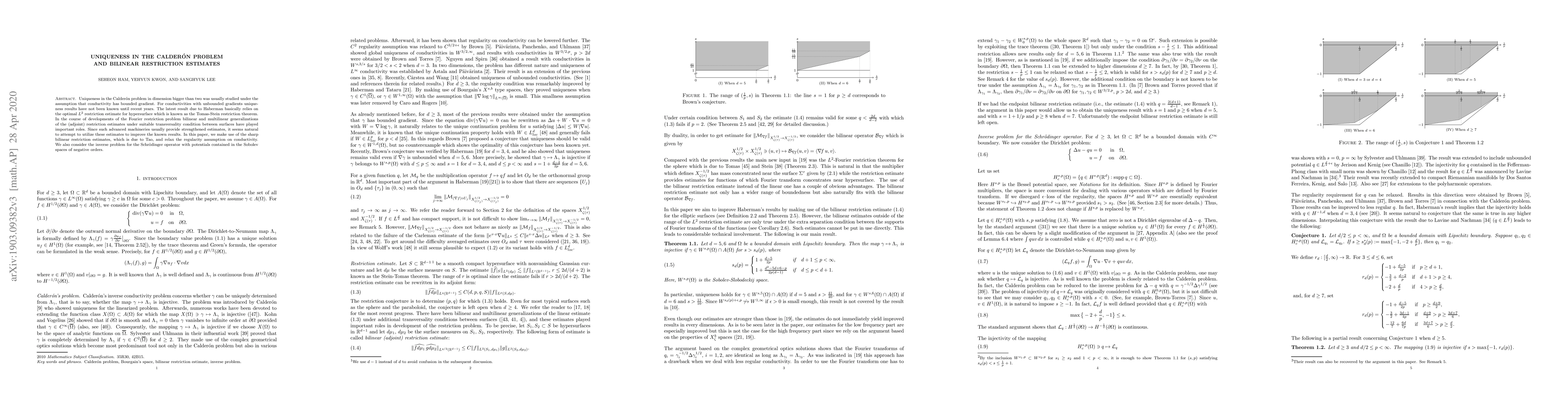 Uniqueness in the Calder\'on problem in dimension bigger than two was usually studied under the assumption that conductivity has bounded gradient. For conductivities with unbounded gradients uniqueness results have not been known until recent years. The latest result due to Haberman basically relies on the optimal $L^2$ restriction estimate for hypersurface which is known as the Tomas-Stein restriction theorem. In the course of developments of the Fourier restriction problem bilinear and multilinear generalizations of the (adjoint) restriction estimates under suitable transversality condition between surfaces have played important roles. Since such advanced machineries usually provide strengthened estimates, it seems natural to attempt to utilize these estimates to improve the known results. In this paper, we make use of the sharp bilinear restriction estimates, which is due to Tao, and relax the regularity assumption on conductivity. We also consider the inverse problem for the Schr\"odinger operator with potentials contained in the Sobolev spaces of negative orders.