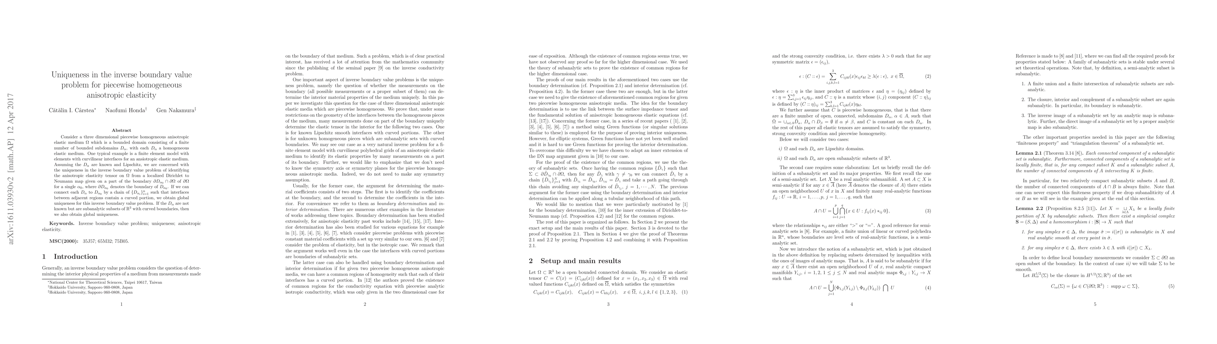 Consider a three dimensional piecewise homogeneous anisotropic elastic medium $\Omega$ which is a bounded domain consisting of a finite number of bounded subdomains $D_\alpha$, with each $D_\alpha$ a homogeneous elastic medium. One typical example is a finite element model with elements with curvilinear interfaces for an ansiotropic elastic medium. Assuming the $D_\alpha$ are known and Lipschitz, we are concerned with the uniqueness in the inverse boundary value problem of identifying the anisotropic elasticity tensor on $\Omega$ from a localized Dirichlet to Neumann map given on a part of the boundary $\partial D_{\alpha_0}\cap\partial\Omega$ of $\partial\Omega$ for a single $\alpha_0$, where $\partial D_{\alpha_0}$ denotes the boundary of $ D_{\alpha_0}$. If we can connect each $D_\alpha$ to $D_{\alpha_0}$ by a chain of $\{D_{\alpha_i}\}_{i=1}^n$ such that interfaces between adjacent regions contain a curved portion, we obtain global uniqueness for this inverse boundary value problem. If the $D_\alpha$ are not known but are subanalytic subsets of $\mathbb{R}^3$ with curved boundaries, then we also obtain global uniqueness.