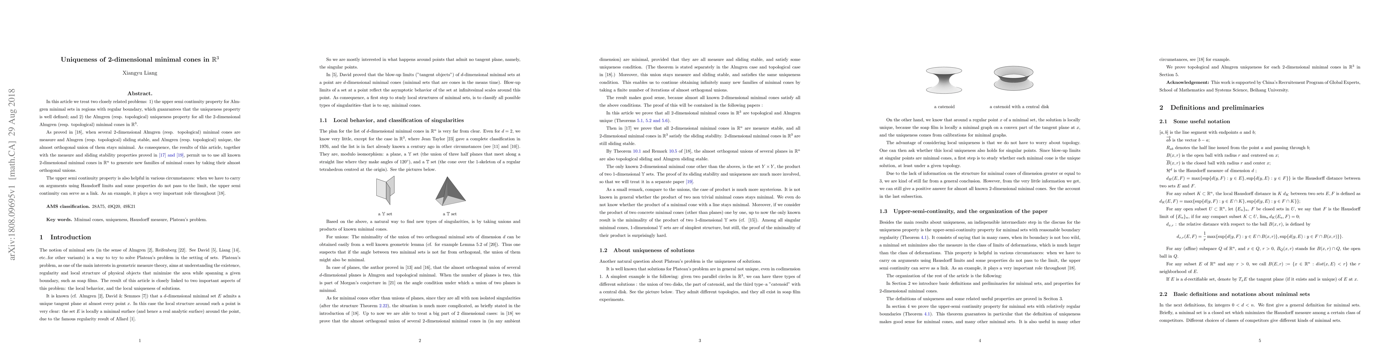 This paper investigates the uniqueness and upper semi-continuity properties of 2-dimensional minimal cones in $\mathbb{R}^3$, establishing that these cones are unique under certain conditions. It also demonstrates how these properties can be used to generate new families of minimal cones through their almost orthogonal unions.