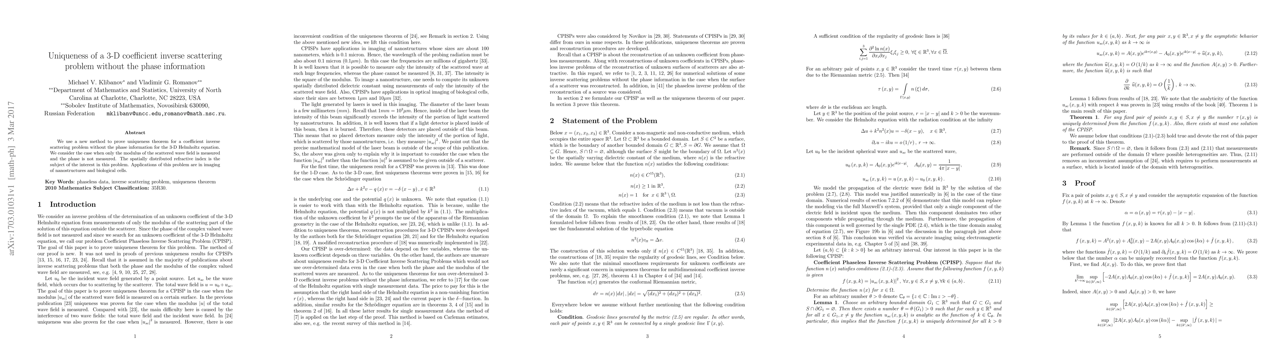 This paper proves the uniqueness of solving a 3-D coefficient inverse scattering problem for the Helmholtz equation without phase information, using only the modulus of the scattered wave field. Applications include imaging of nanostructures and biological cells.