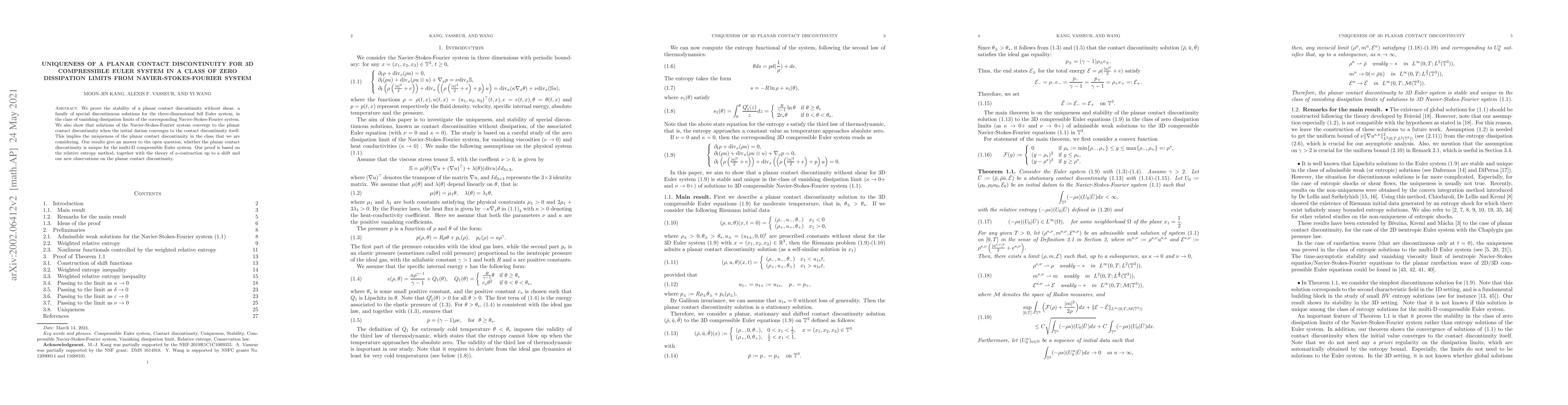 This paper proves the stability and uniqueness of planar contact discontinuities in 3D compressible Euler systems, showing they emerge from vanishing dissipation limits of the Navier-Stokes-Fourier system. The proof employs the relative entropy method and $a$-contraction theory.