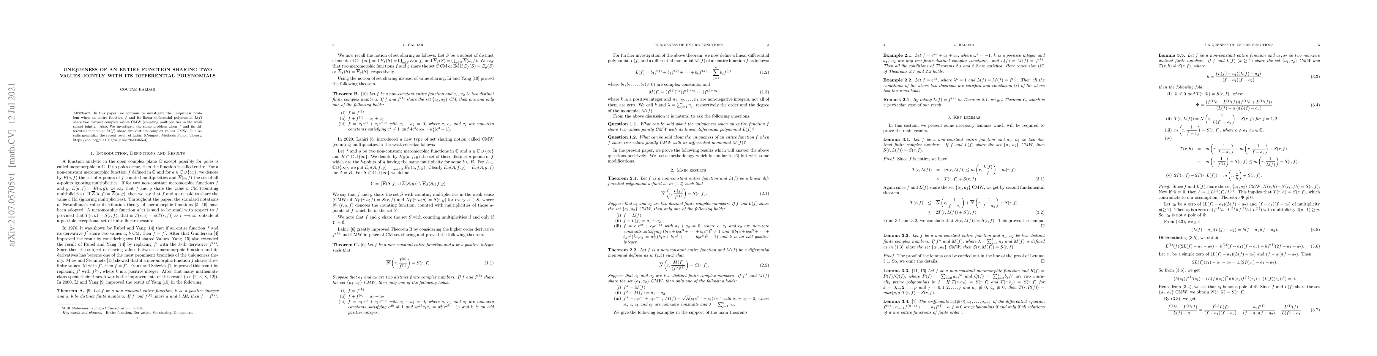 This paper explores the uniqueness of entire functions that share two distinct complex values with their linear differential polynomials and differential monomials, extending recent findings by Lahiri. The study addresses the problem in the context of counting multiplicities in the weak sense.