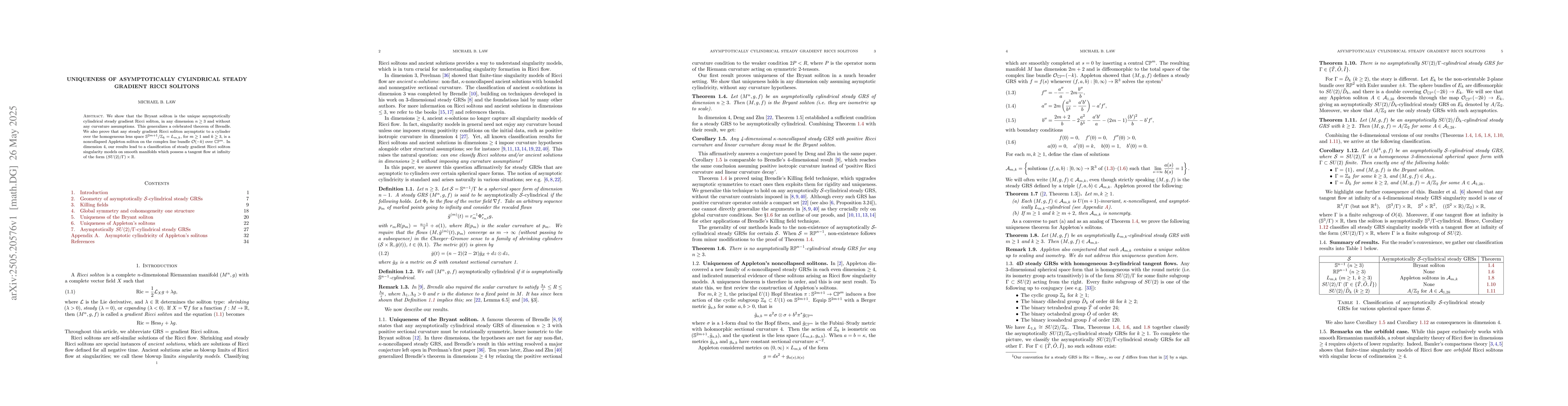 The paper presents a comprehensive analysis of asymptotically cylindrical steady gradient Ricci solitons, establishing uniqueness results and classifying singularity models in specific dimensions.