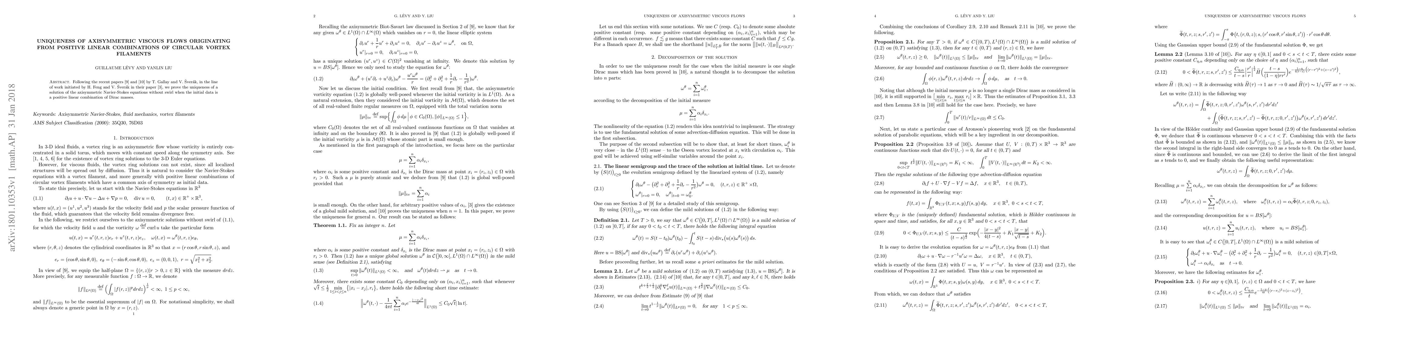 Summary: This paper proves the uniqueness of axisymmetric viscous flow solutions to the Navier-Stokes equations without swirl, provided the initial data is a positive linear combination of circular vortex filaments. The result builds on the foundational work of Gallay, Šverák, Feng, and Šverák.