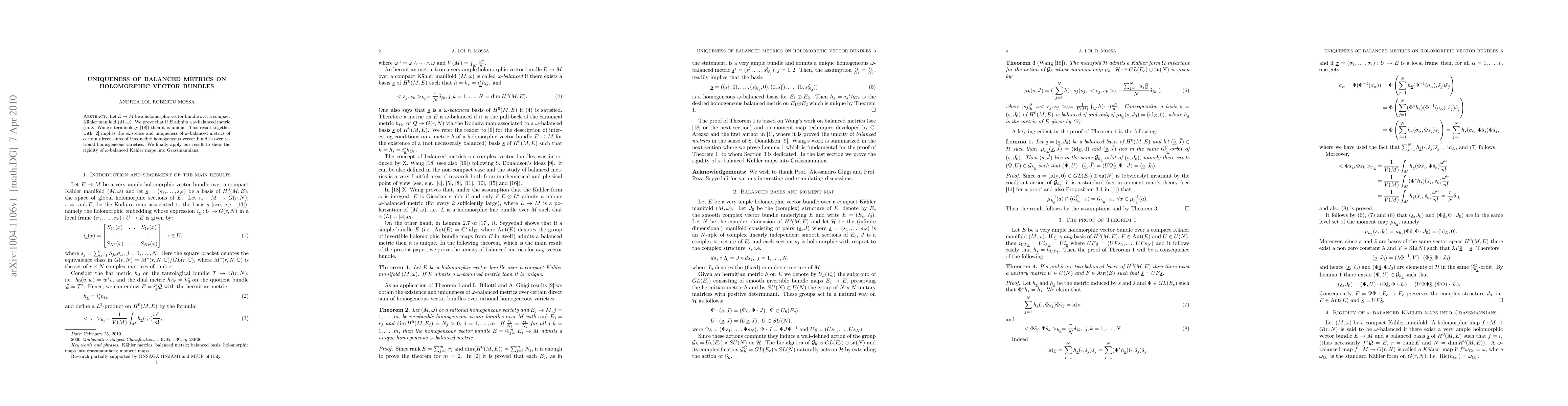 The paper proves that a holomorphic vector bundle over a compact Kaehler manifold with a $ heta$-balanced metric is unique, with implications for the existence and uniqueness of certain direct sums of irreducible homogeneous vector bundles.