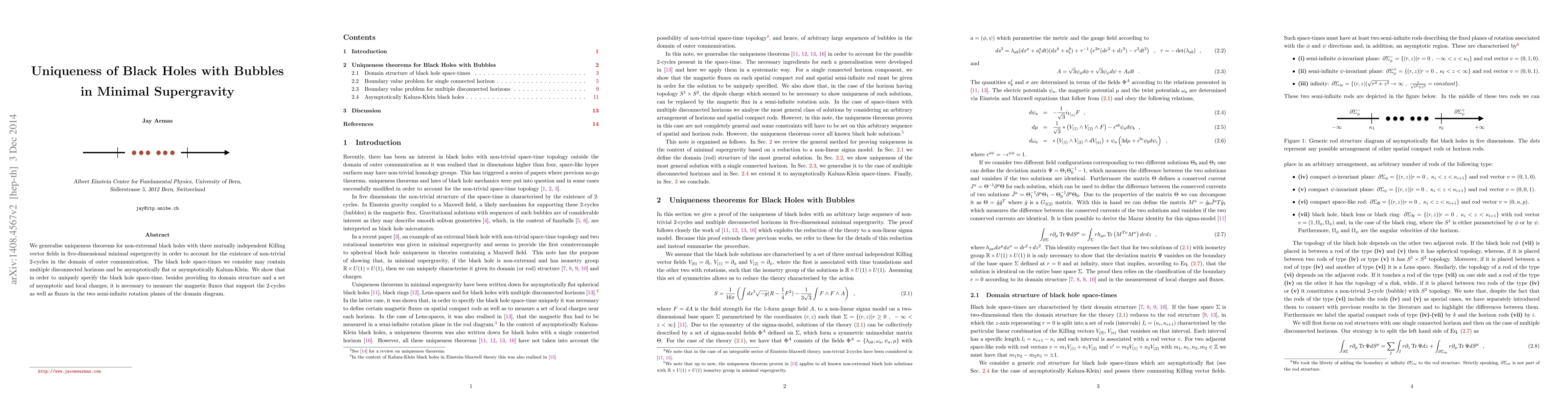 We generalise uniqueness theorems for non-extremal black holes with three mutually independent Killing vector fields in five-dimensional minimal supergravity in order to account for the existence of non-trivial 2-cycles in the domain of outer communication. The black hole space-times we consider may contain multiple disconnected horizons and be asymptotically flat or asymptotically Kaluza-Klein. We show that in order to uniquely specify the black hole space-time, besides providing its domain structure and a set of asymptotic and local charges, it is necessary to measure the magnetic fluxes that support the 2-cycles as well as fluxes in the two semi-infinite rotation planes of the domain diagram.