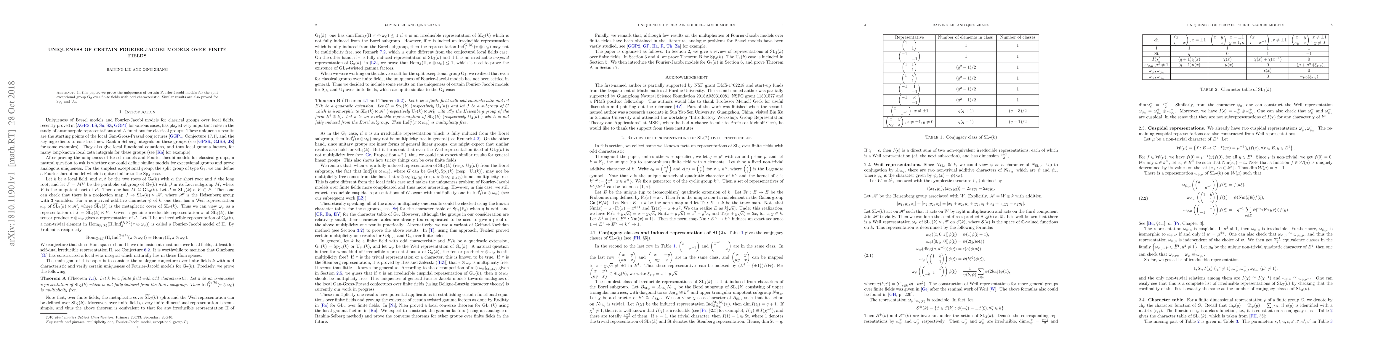 This paper establishes the uniqueness of Fourier-Jacobi models for the split exceptional group $G_2$ over finite fields with odd characteristic, with analogous results also demonstrated for $Sp_4$ and $U_4$. The research focuses on the structural properties of these models in finite field settings.