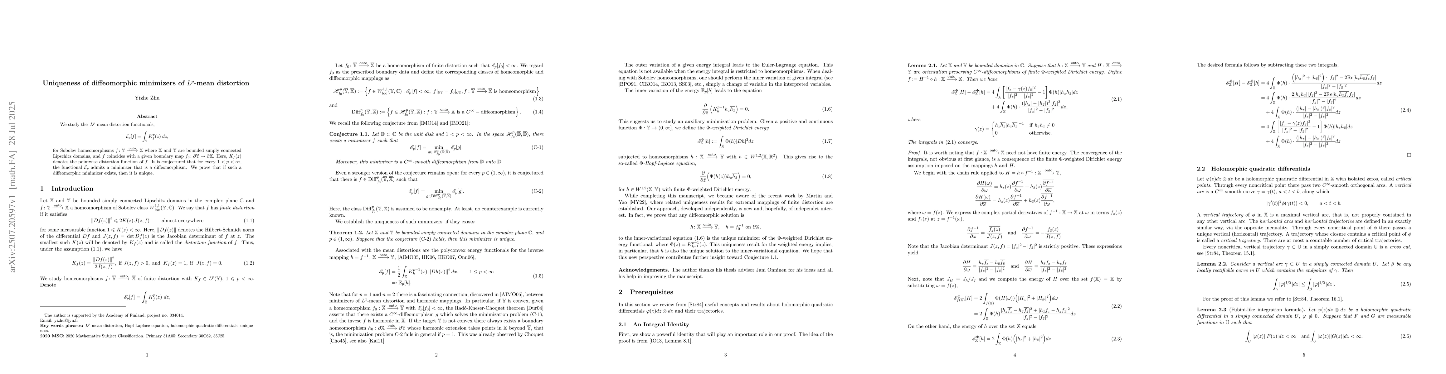 We study the $L^p$-mean distortion functionals, \[{\cal E}_p[f] = \int_\mathbb Y K^p_f(z) \; dz, \] for Sobolev homeomorphisms $f: \overline{\mathbb Y}\xrightarrow{\rm onto} \overline{\mathbb X}$ where $\mathbb X$ and $\mathbb Y$ are bounded simply connected Lipschitz domains, and $f$ coincides with a given boundary map $f_0 \colon \partial \mathbb Y \to \partial \mathbb X$. Here, $K_f(z)$ denotes the pointwise distortion function of $f$. It is conjectured that for every $1 < p < \infty$, the functional $\mathcal{E}_p$ admits a minimizer that is a diffeomorphism. We prove that if such a diffeomorphic minimizer exists, then it is unique.
