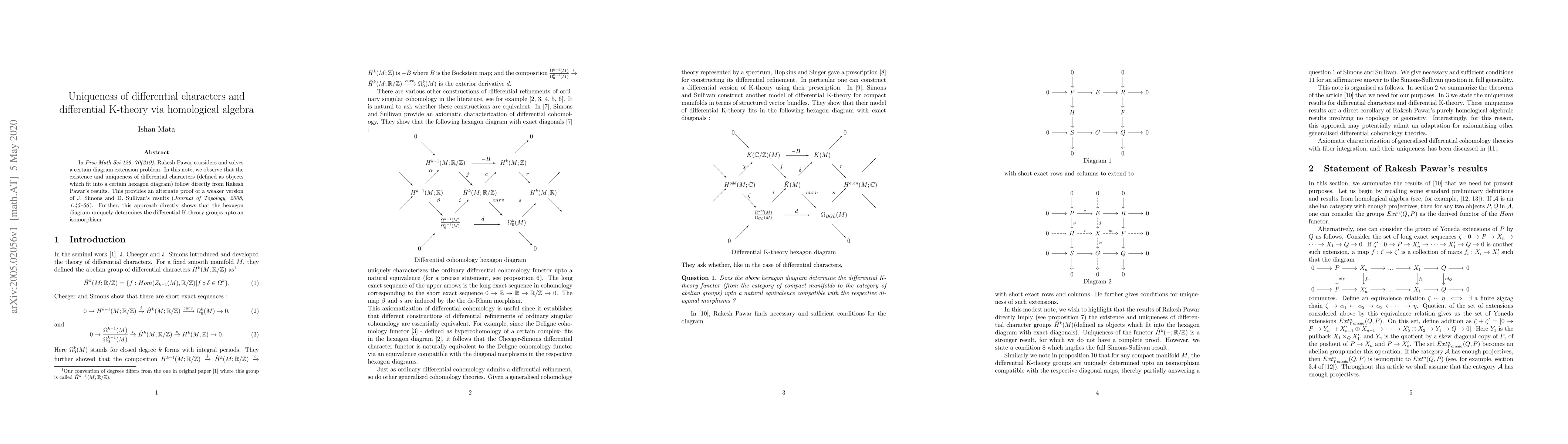 In Proc Math Sci 129, 70(219), Rakesh Pawar considers and solves a certain extension problem. In this note, we observe that the existence and uniqueness of differential characters (defined as objects which fit into a hexagon diagram) follow directly from Rakesh Pawar's results. This provides an alternate proof of a weaker version of the results of J. Simons and D. Sullivan, Journal of Topology, 2008, vol 1:45-56. Further this approach directly shows that the hexagon diagram uniquely determines the differential K-theory groups upto an isomorphism.