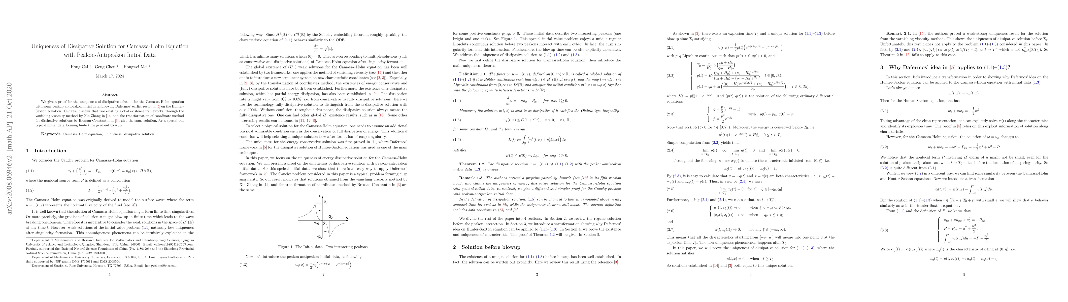 This paper proves the uniqueness of dissipative solutions for the Camassa-Holm equation with peakon-antipeakon initial data, aligning with Dafermos' earlier work on the Hunter-Saxton equation. It demonstrates that two existing global existence frameworks yield the same solution for a specific type of initial data that leads to finite time gradient blowup.