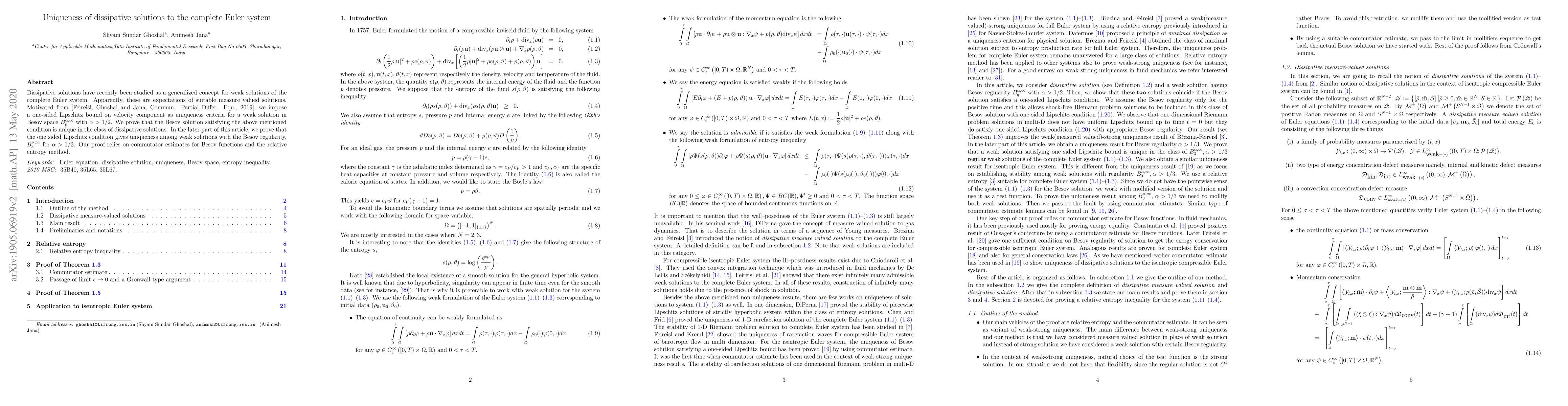 This paper investigates the uniqueness of dissipative solutions to the complete Euler system by imposing a one-sided Lipschitz bound on velocity components. The authors prove that solutions satisfying this condition are unique in Besov spaces $B^{\alpha,\infty}_{p}$ with $\alpha>1/2$ and further extend this uniqueness to $B^{\alpha,\infty}_{3}$ for $\alpha>1/3$ using commutator estimates and the relative entropy method.
