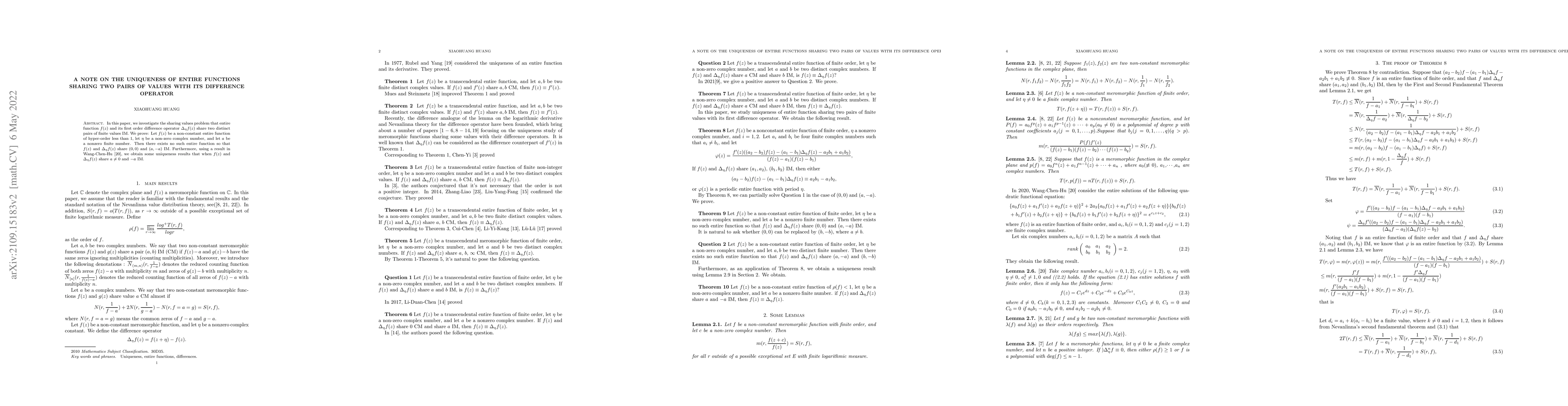 In this paper, we investigate the sharing values problem that entire function $f(z)$ and its first order difference operator $\Delta_{\eta}f(z)$ share two distinct pairs of finite values IM. We prove: Let $f(z)$ be a non-constant entire function of hyper-order less than $1$, let $\eta$ be a non-zero complex number, and let $a$ be a nonzero finite number. Then there exists no such entire function so that $ f(z)$ and $\Delta_{\eta}f(z)$ share $(0,0)$ and $(a,-a)$ IM. Furthermore, using a result in Wang-Chen-Hu \cite{wch}, we obtain some uniqueness results that when $ f(z)$ and $\Delta_{\eta}f(z)$ share $a\neq0$ and $-a$ IM.