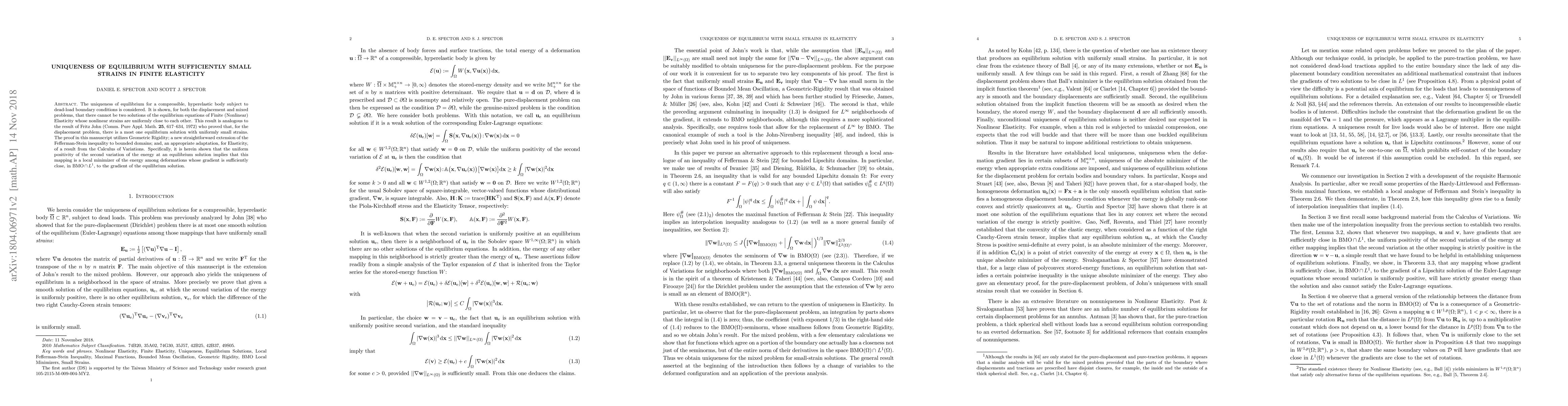 The uniqueness of equilibrium for a compressible, hyperelastic body subject to dead-load boundary conditions is considered. It is shown, for both the displacement and mixed problems, that there cannot be two solutions of the equilibrium equations of Finite (Nonlinear) Elasticity whose nonlinear strains are uniformly close to each other. This result is analogous to the result of Fritz John (Comm. Pure Appl. Math. 25, 617-634, 1972) who proved that, for the displacement problem, there is a most one equilibrium solution with uniformly small strains. The proof in this manuscript utilizes Geometric Rigidity; a new straightforward extension of the Fefferman-Stein inequality to bounded domains; and, an appropriate adaptation, for Elasticity, of a result from the Calculus of Variations. Specifically, it is herein shown that the uniform positivity of the second variation of the energy at an equilibrium solution implies that this mapping is a local minimizer of the energy among deformations whose gradient is sufficiently close, in $BMO\cap\, L^1$, to the gradient of the equilibrium solution.