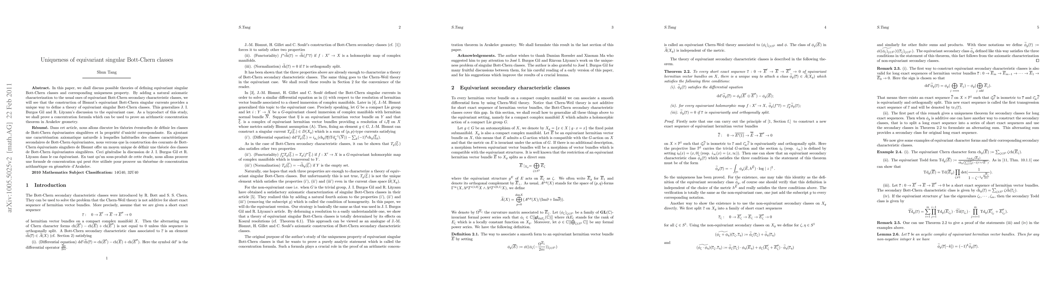 The paper discusses the definition and uniqueness of equivariant singular Bott-Chern classes, extending previous work to the equivariant case by adding a natural axiomatic characterization to usual equivariant Bott-Chern secondary characteristic classes.